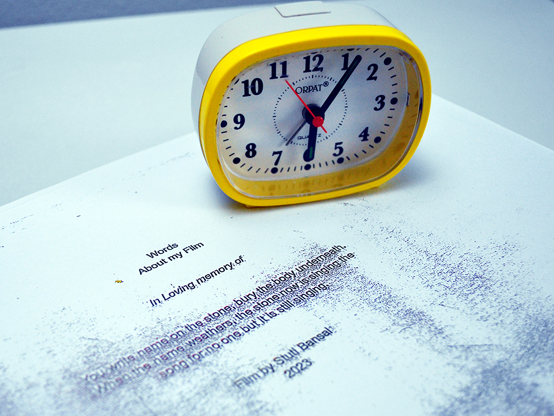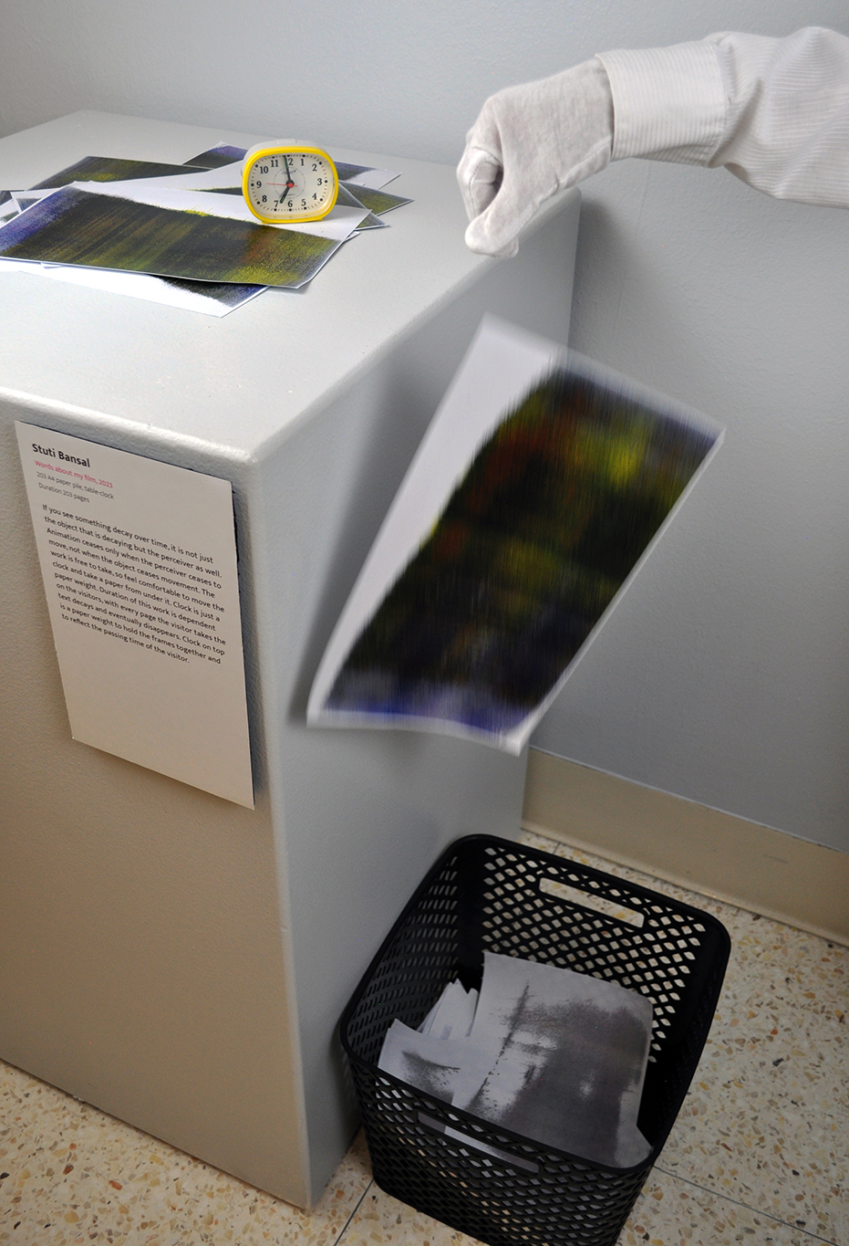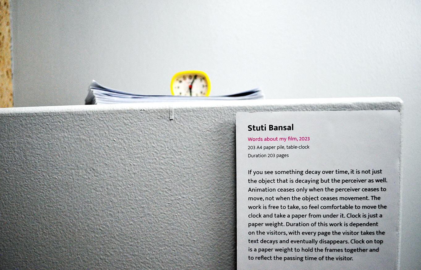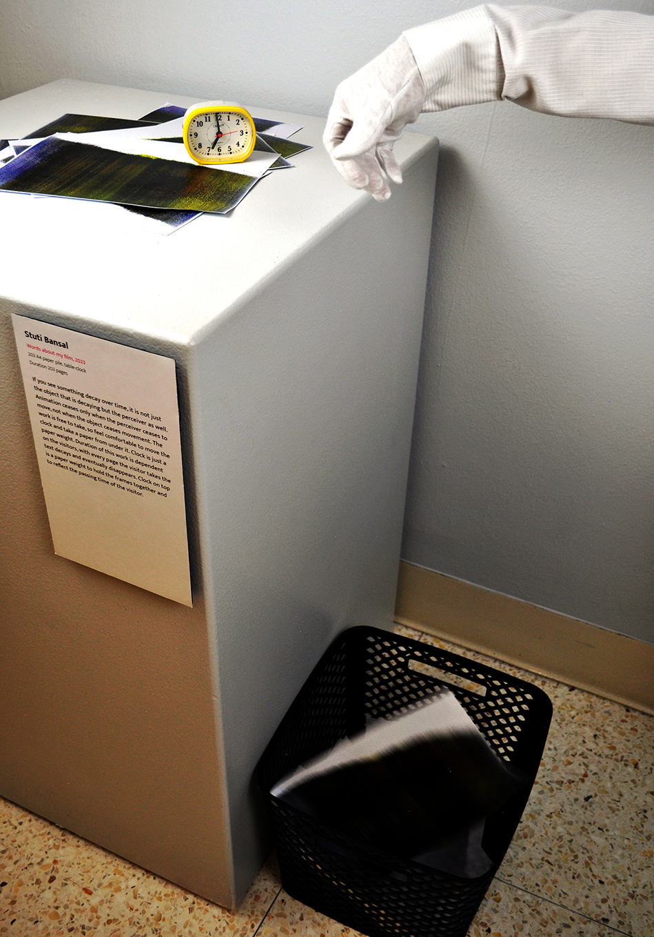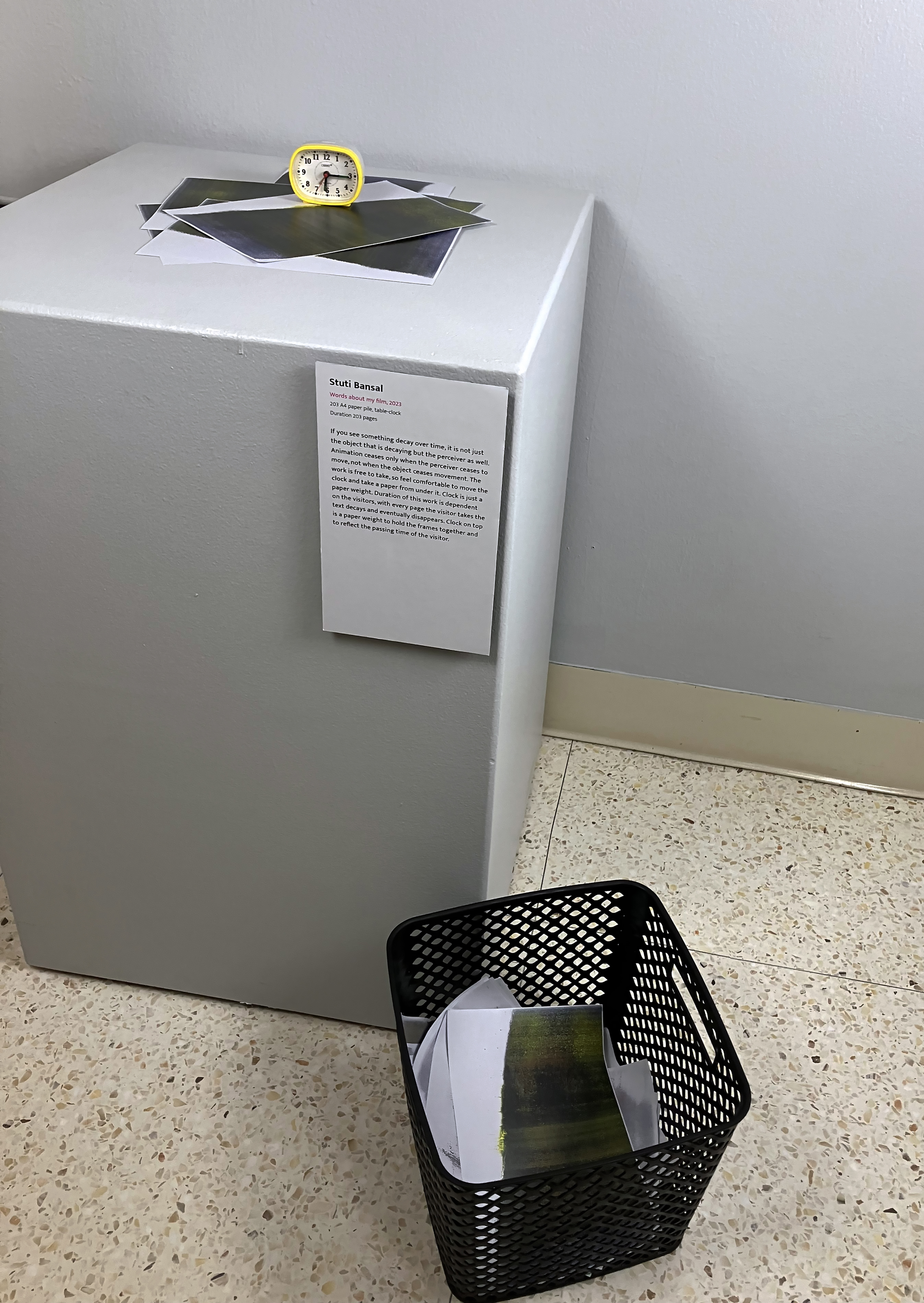 A clock on top of the stack is a paper weight, binding the stack of papers in a timeline. The duration of this work is dependent on the visitors: with every page they take, the text decays and eventually disappears. The philosophical notion that the perceiver decays with the perceived. The clock marks the time of the viewer. As well, it establishes the timeline of the film. A film that cannot be repeated. One that mimics the ephemerality of memory.