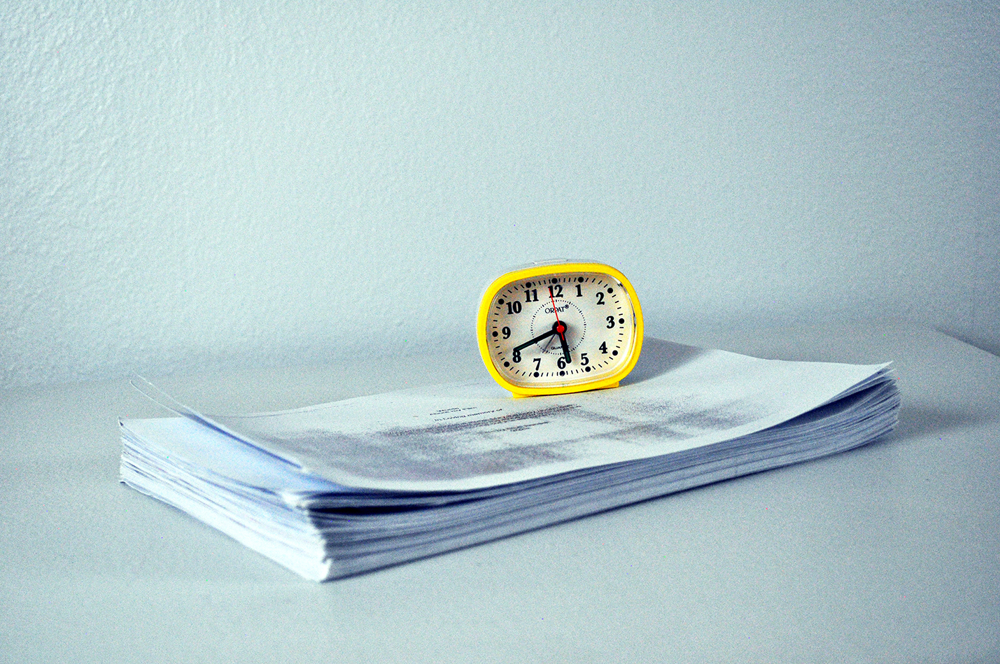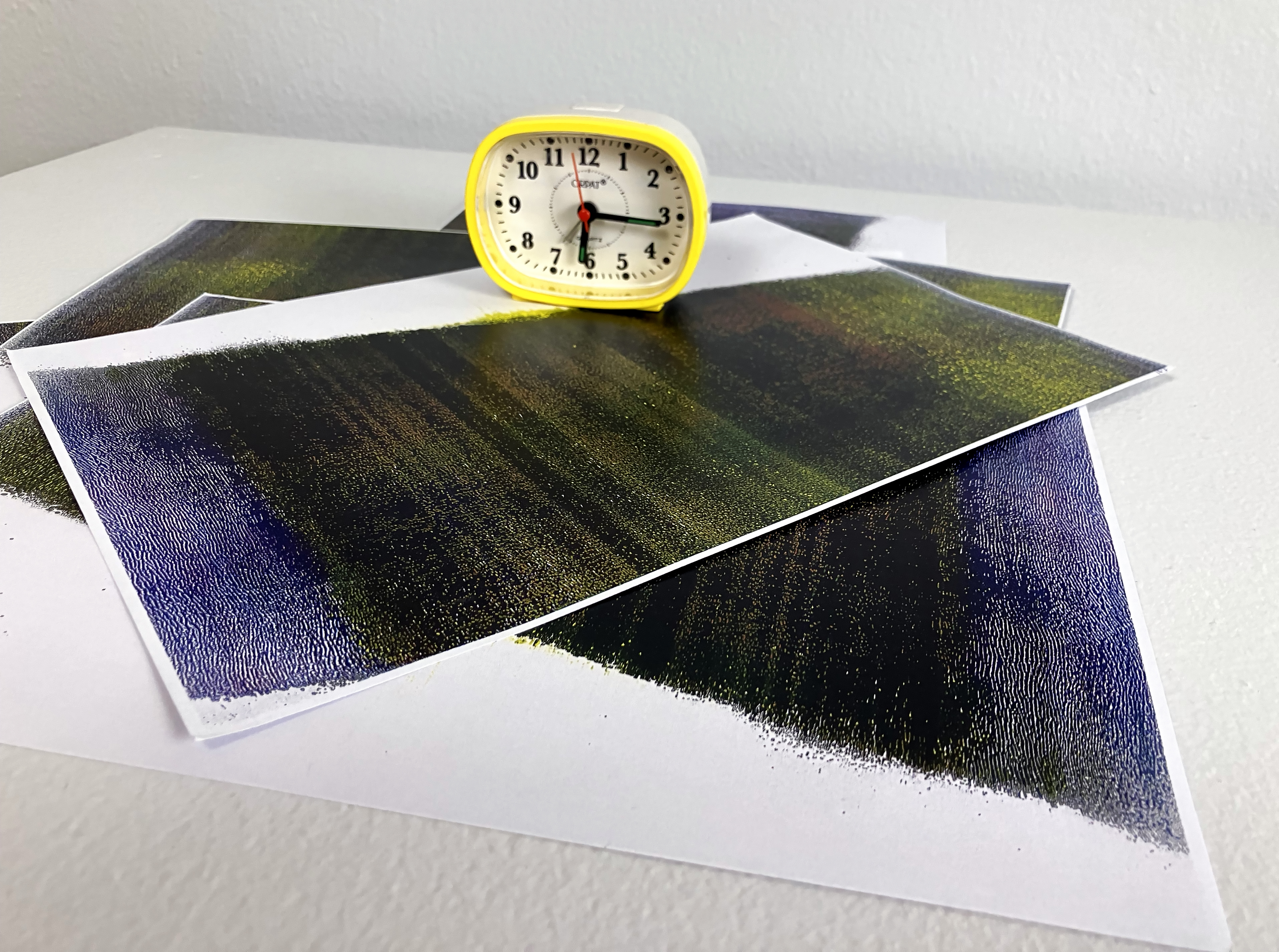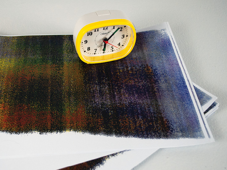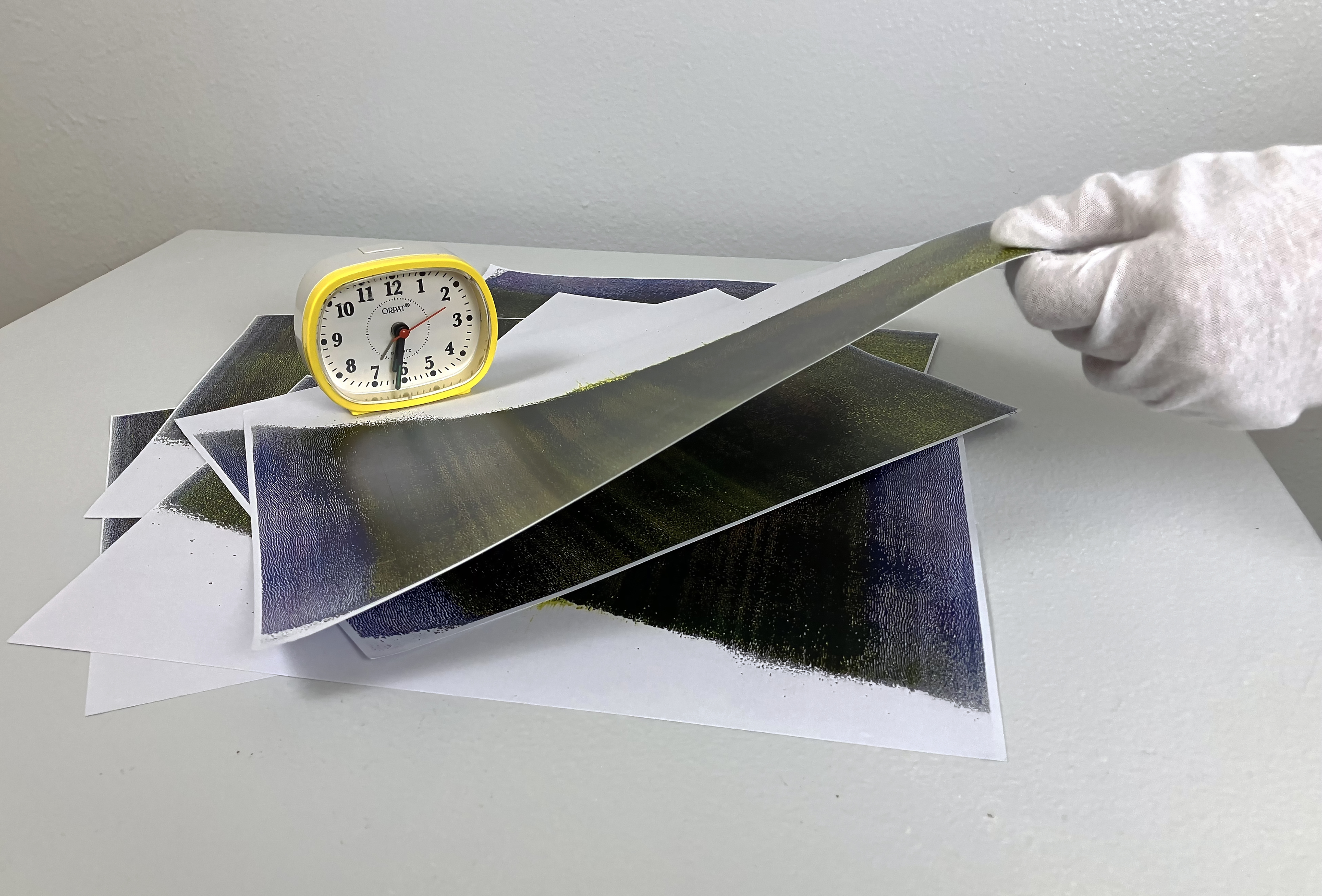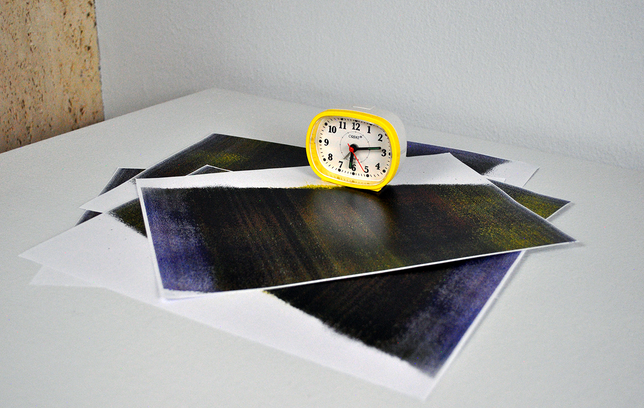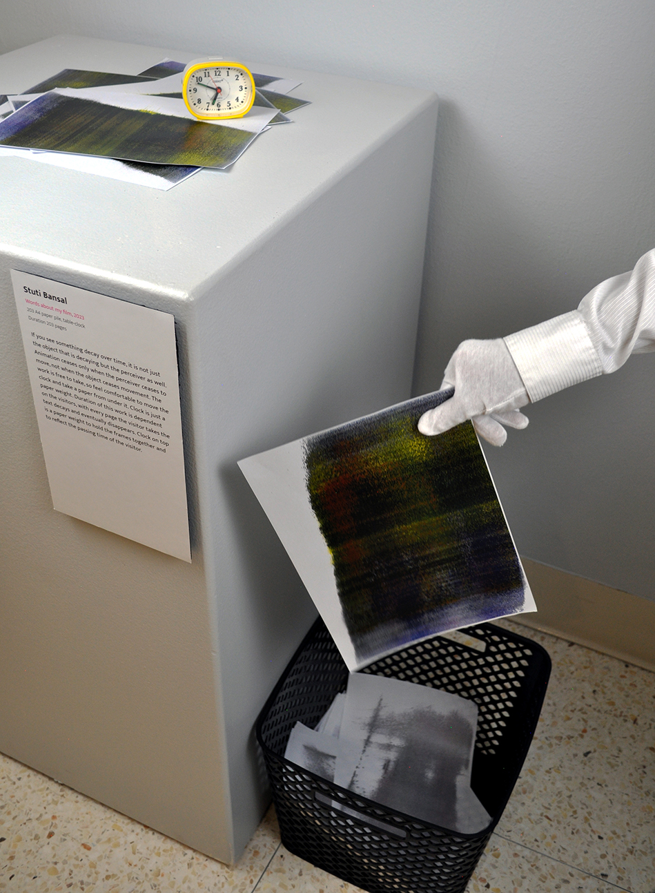 A clock on top of the stack is a paper weight, binding the stack of papers in a timeline. The duration of this work is dependent on the visitors: with every page they take, the text decays and eventually disappears. The philosophical notion that the perceiver decays with the perceived. The clock marks the time of the viewer. As well, it establishes the timeline of the film. A film that cannot be repeated. One that mimics the ephemerality of memory.