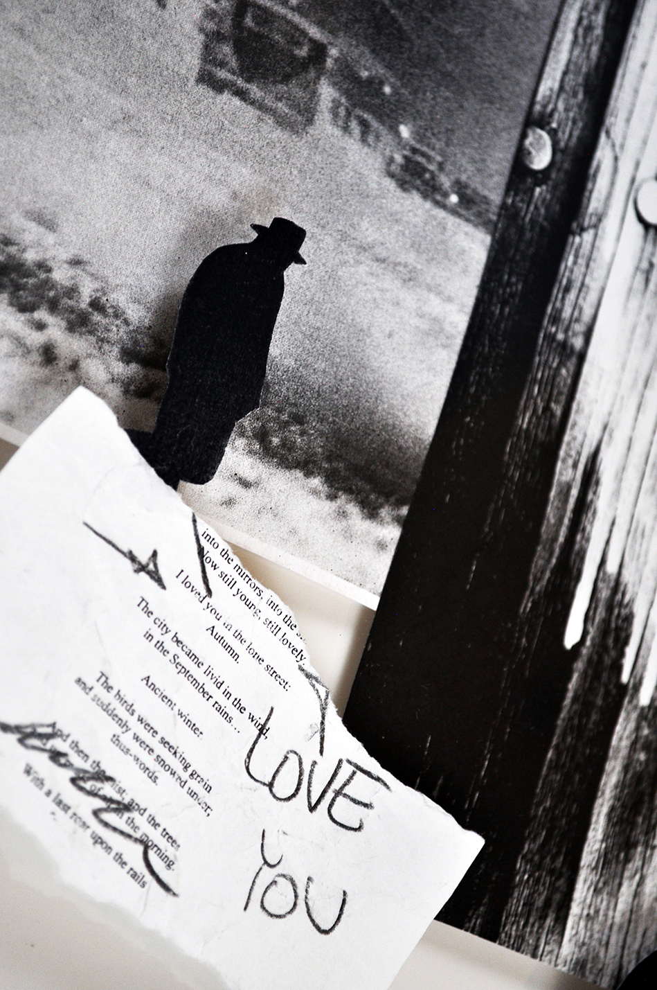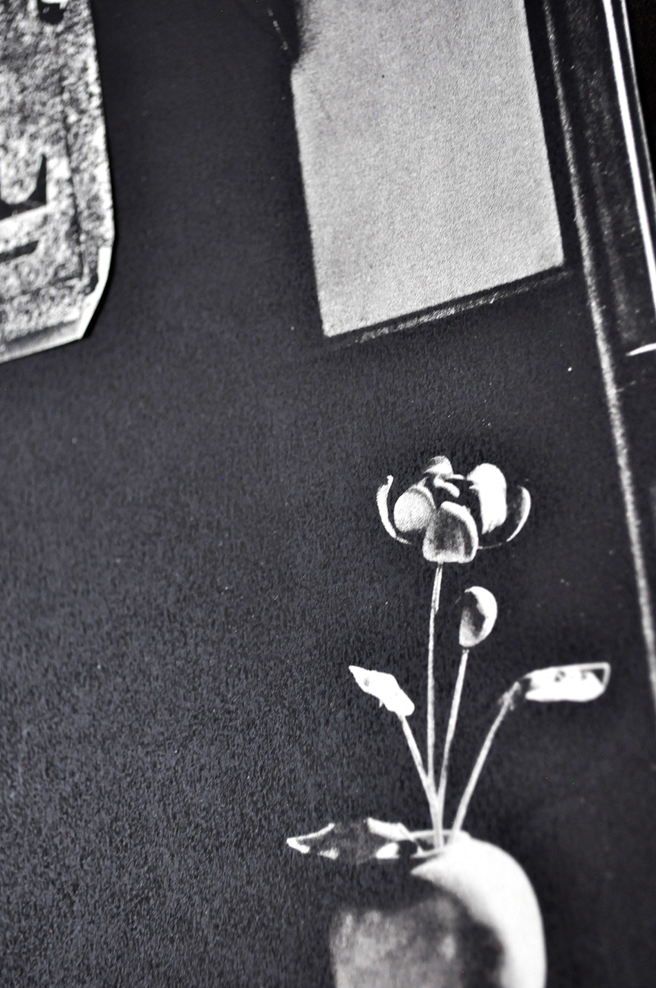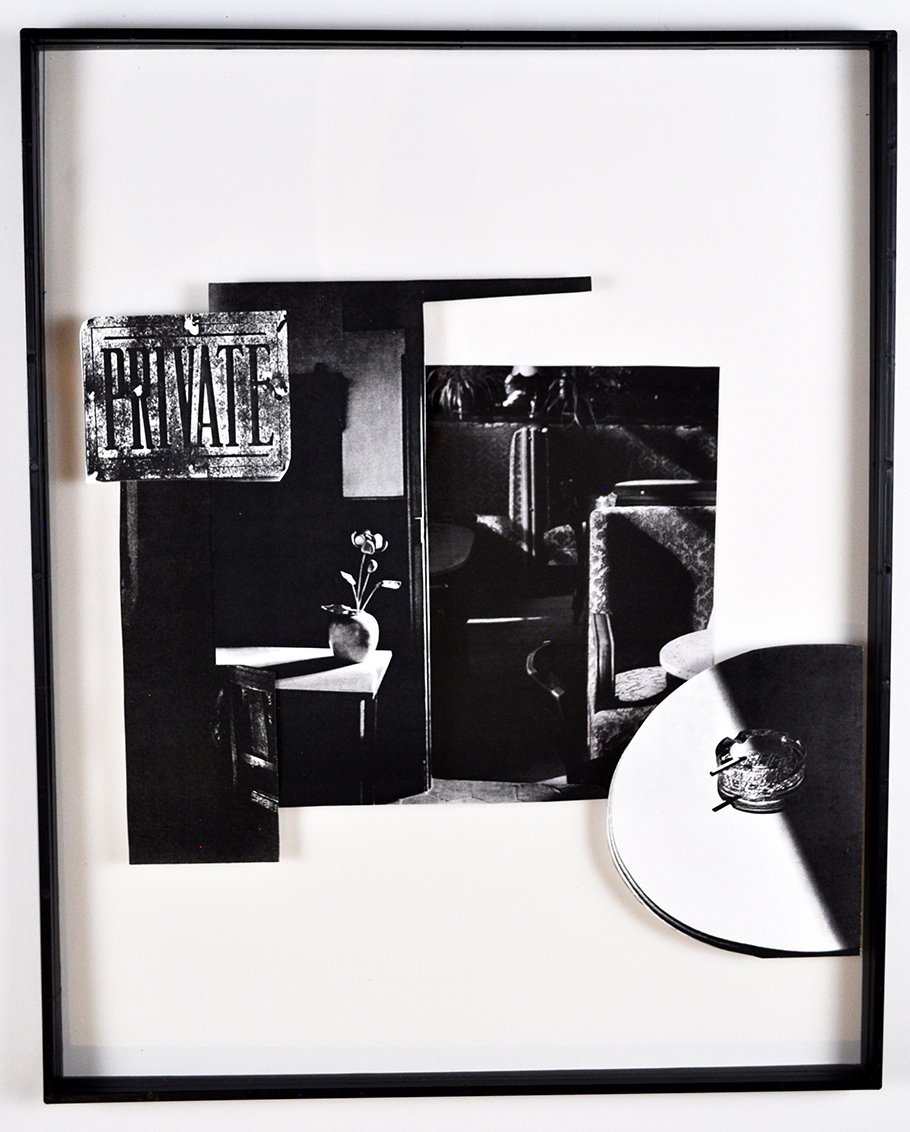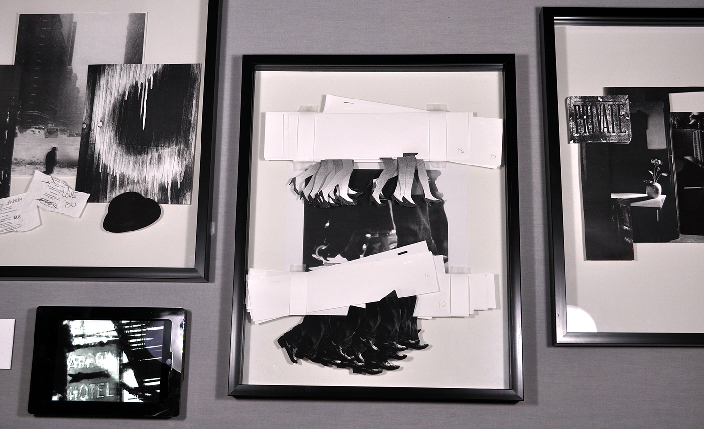 Materials are instrumental to my art practice, especially the photographic material. For the exhibition I presented four framed panels with some of the original artwork from my 16mm film L.City. The film, an archive of love memories that unfolds along the lines of a poem, is created with thousands of black and white paper cutouts, and collaged photocopies inspired by iconic photography of the last century, animated with various techniques directly under a Oxberry16mm camera with the help of a self-built multiplane structure. Three of the panels in the show have photocopies and paper cutouts layered similarly to the way they were originally shot, although compressed in a smaller space and with shorter distance in-between the layers.