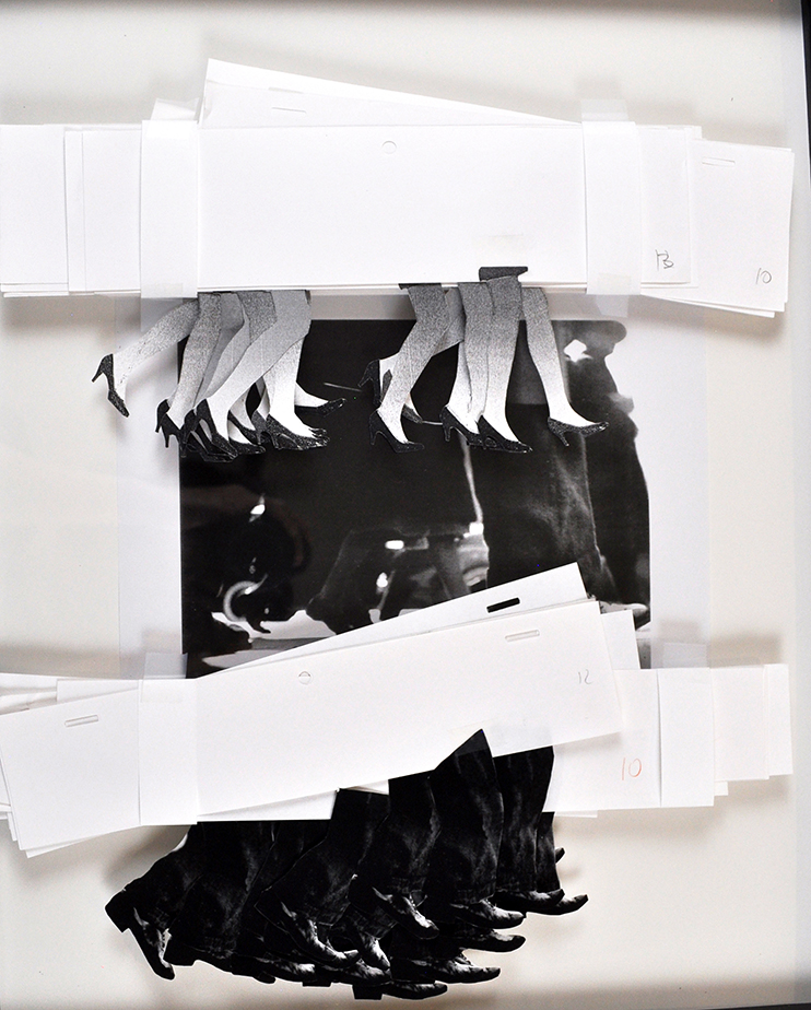 The fourth panel has some of artwork used in a scene depicting people walking at street level, with the point of view lower on the ground. The legs were first digitally cut out from one single photo, then re-drawn to simulate all the key poses of a walk, then printed on paper again. Several pairs of legs were taped on punched paper, to allow registration with a pegbar.