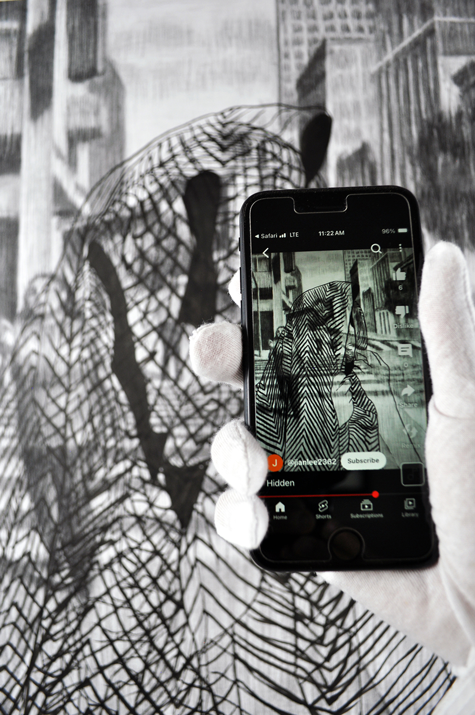 One day, I encountered a person on a street who were covering themselves with a thick blanket even though it was hot and sunny. The contrast between this person, fully covered amidst others in summer clothes, created a striking image of isolation within the bustling crowd and gave me inspiration to draw Hidden.