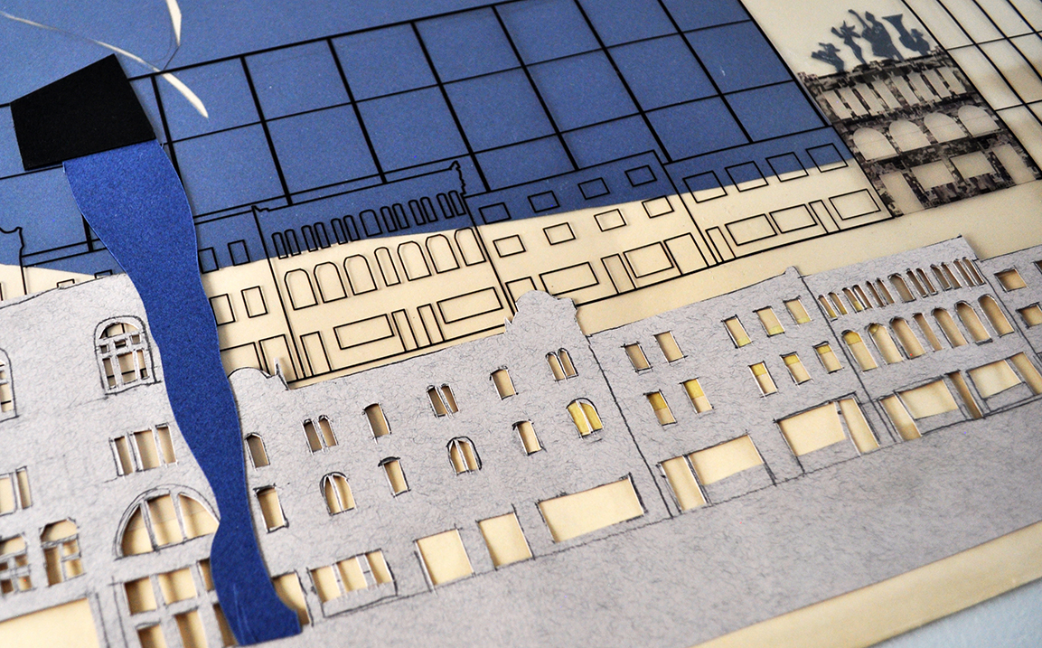 The film, produced at Concordia University and with the collaboration of local music composer Tristan Capacchione, was made almost exclusively with paper-cut silhouettes, surfaces and other objects on a light table in the stop-motion technique. For the filmmaker, the artisanal way of making the film was a sensorial exploration of the historic neighbourhood in question, but also an expression of resistance to the dominant computer-generated depictions of new urban developments. Thus, craft and technique become a metaphor for all the human experience, which moulds the city and its buildings, often unruly yet deeply meaningful.