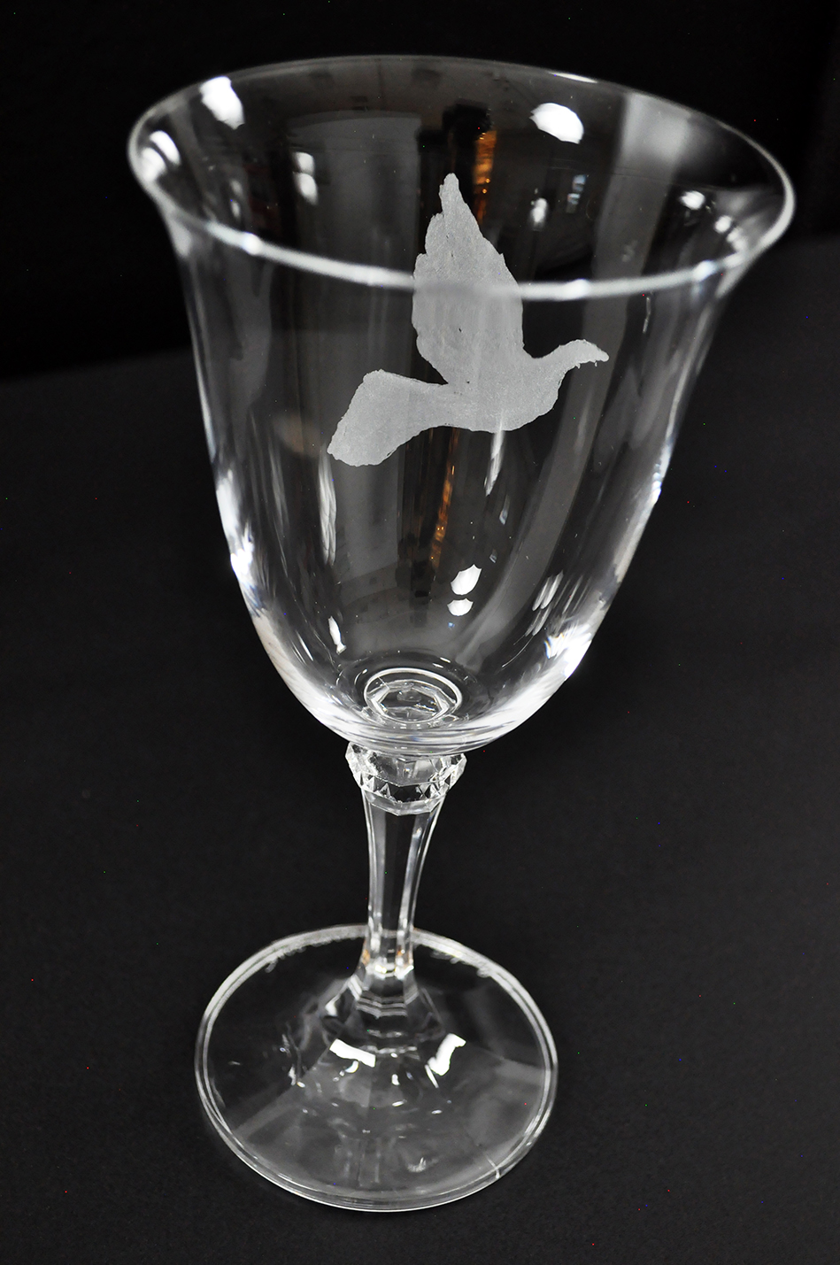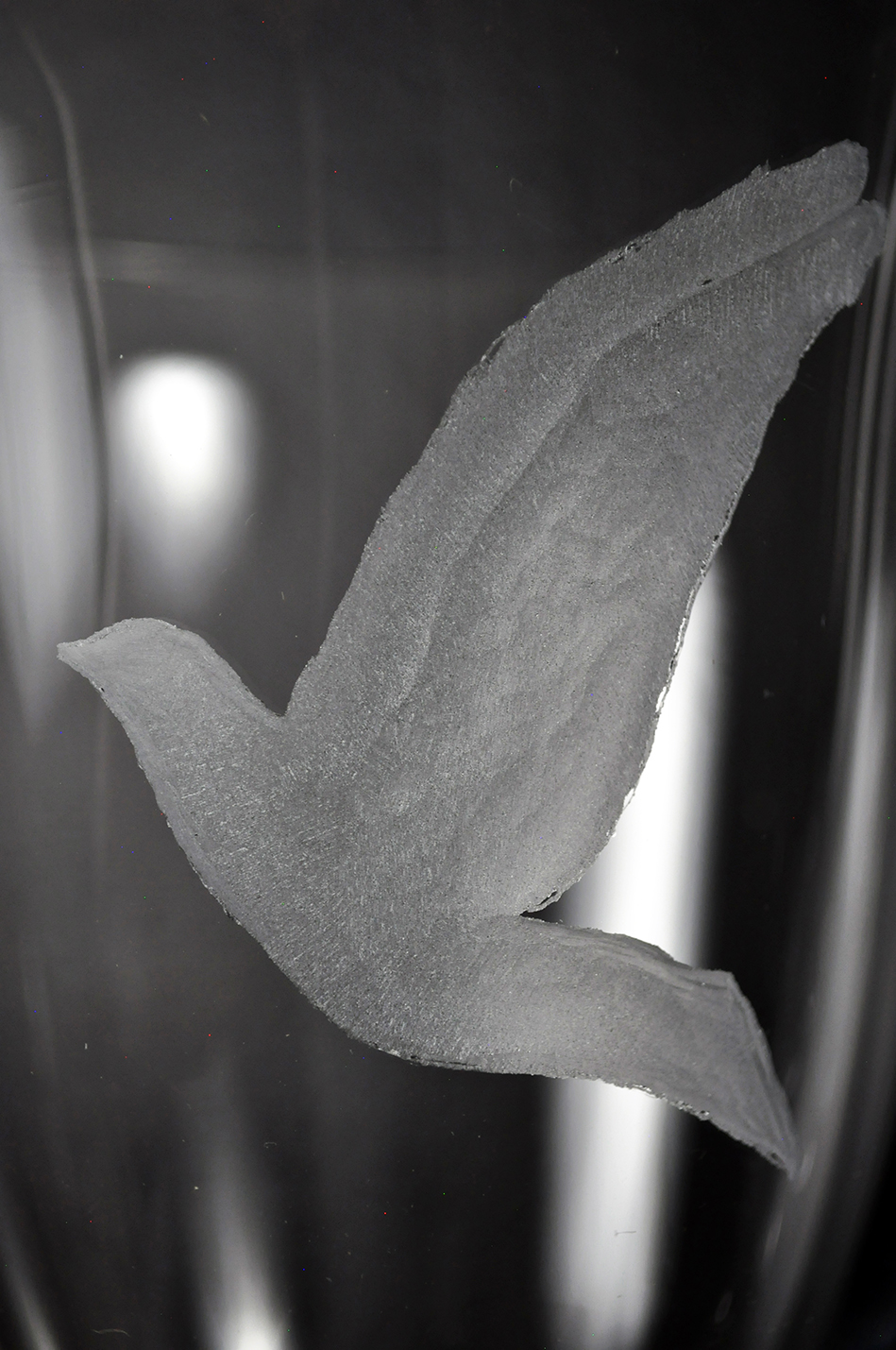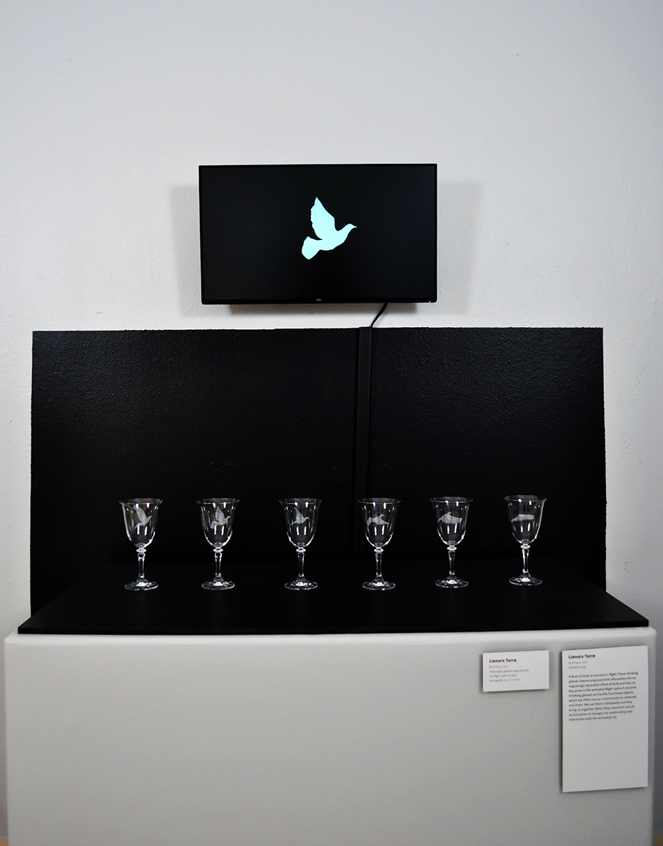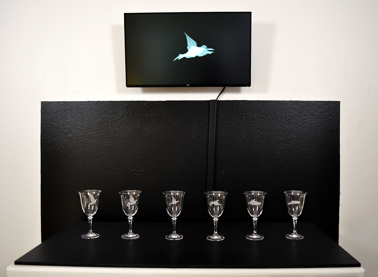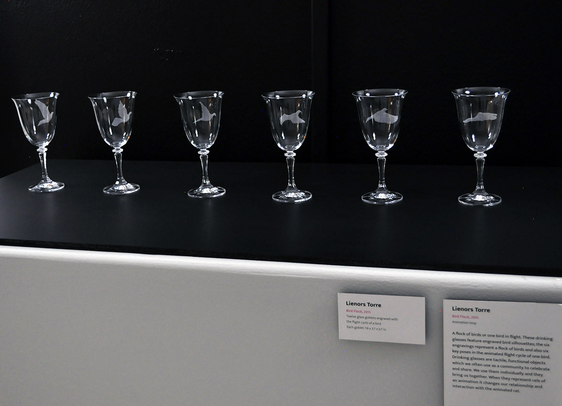 Bird Flock (2015). A flock of birds or one bird in flight. These drinking glasses feature engraved bird silhouettes. The six engravings represent a flock of birds; simultaneously, they suggest six key poses in the animated flight cycle of a single bird. Drinking glasses are tactile, functional objects. When they represent the cells of an animation it changes our relationship and interaction with the animated cell.