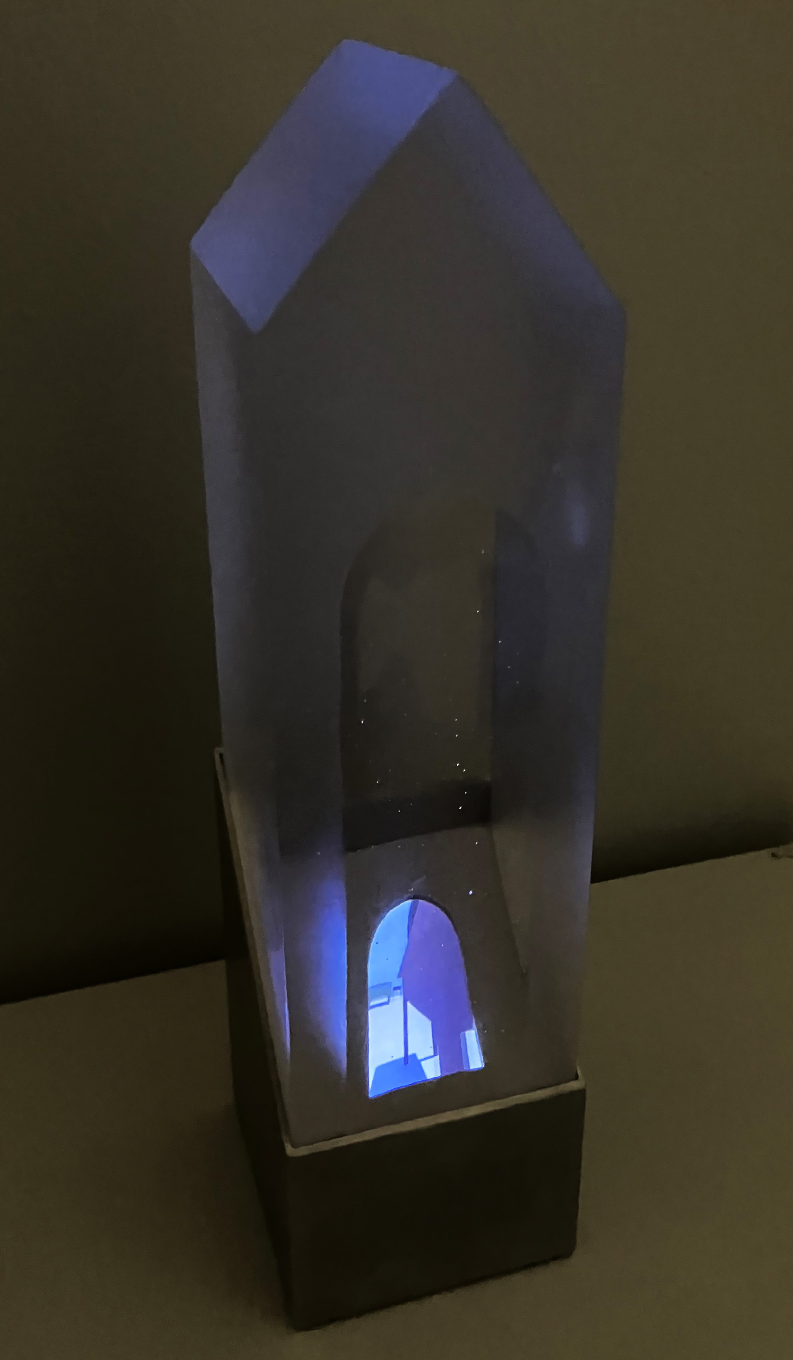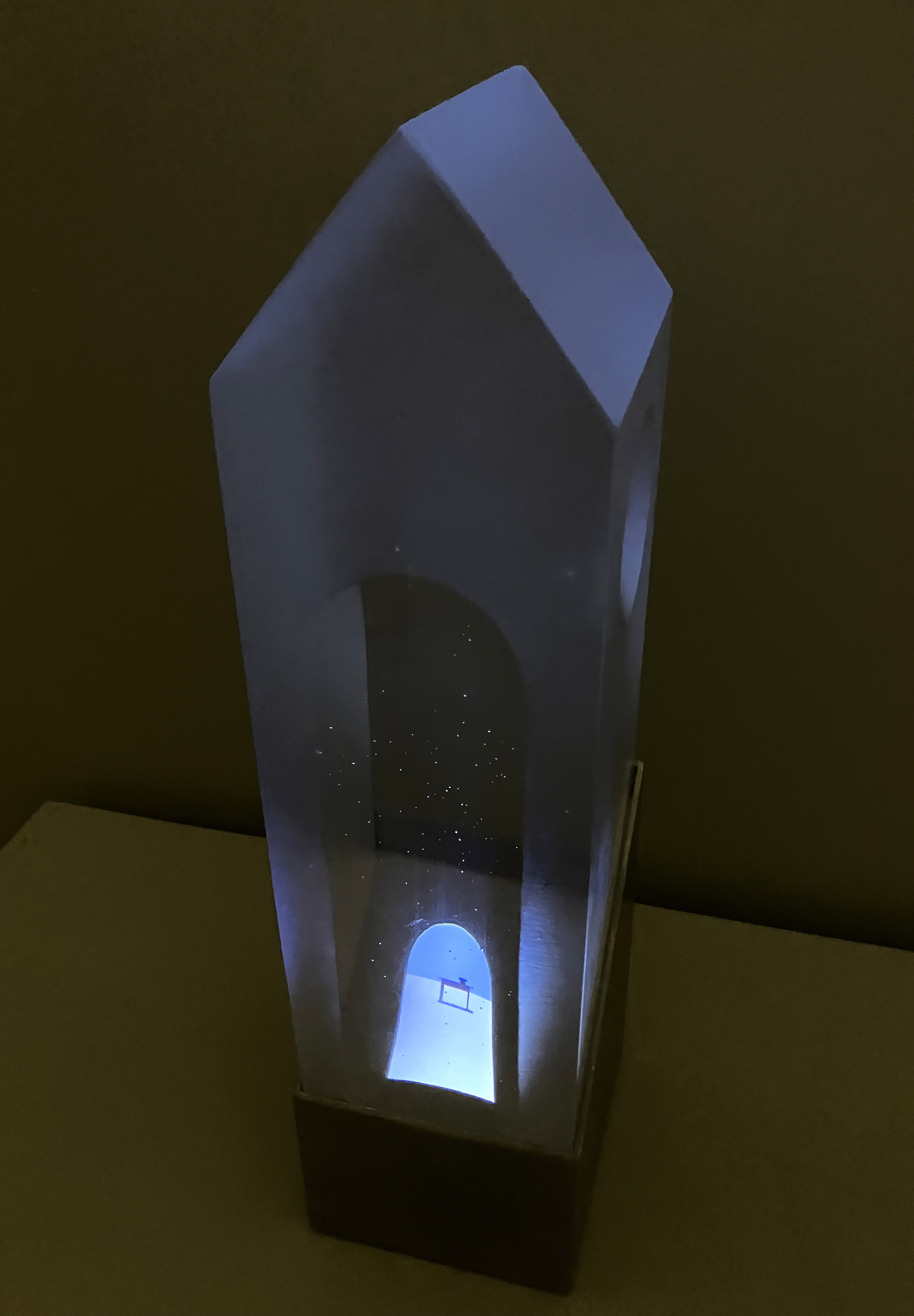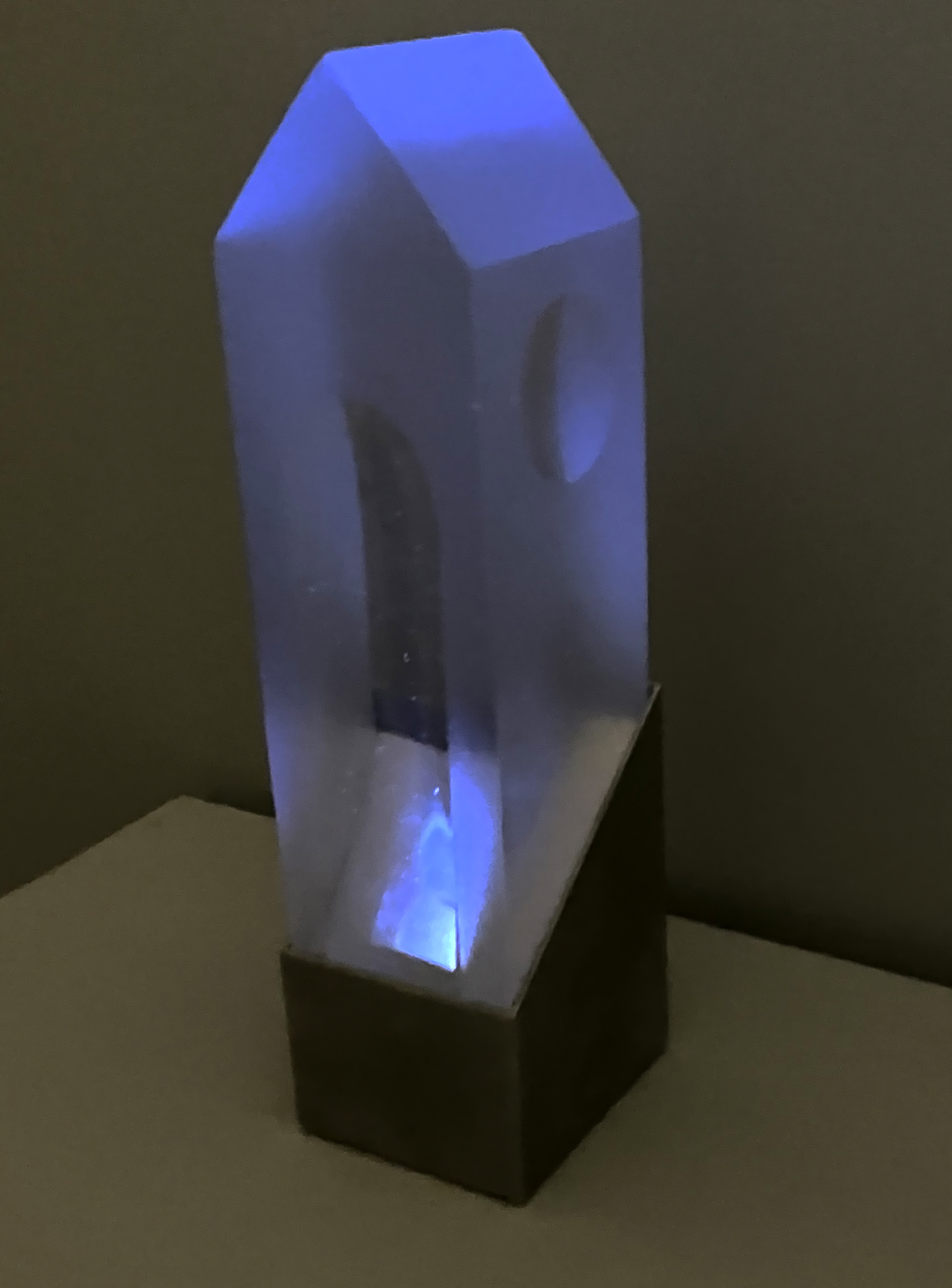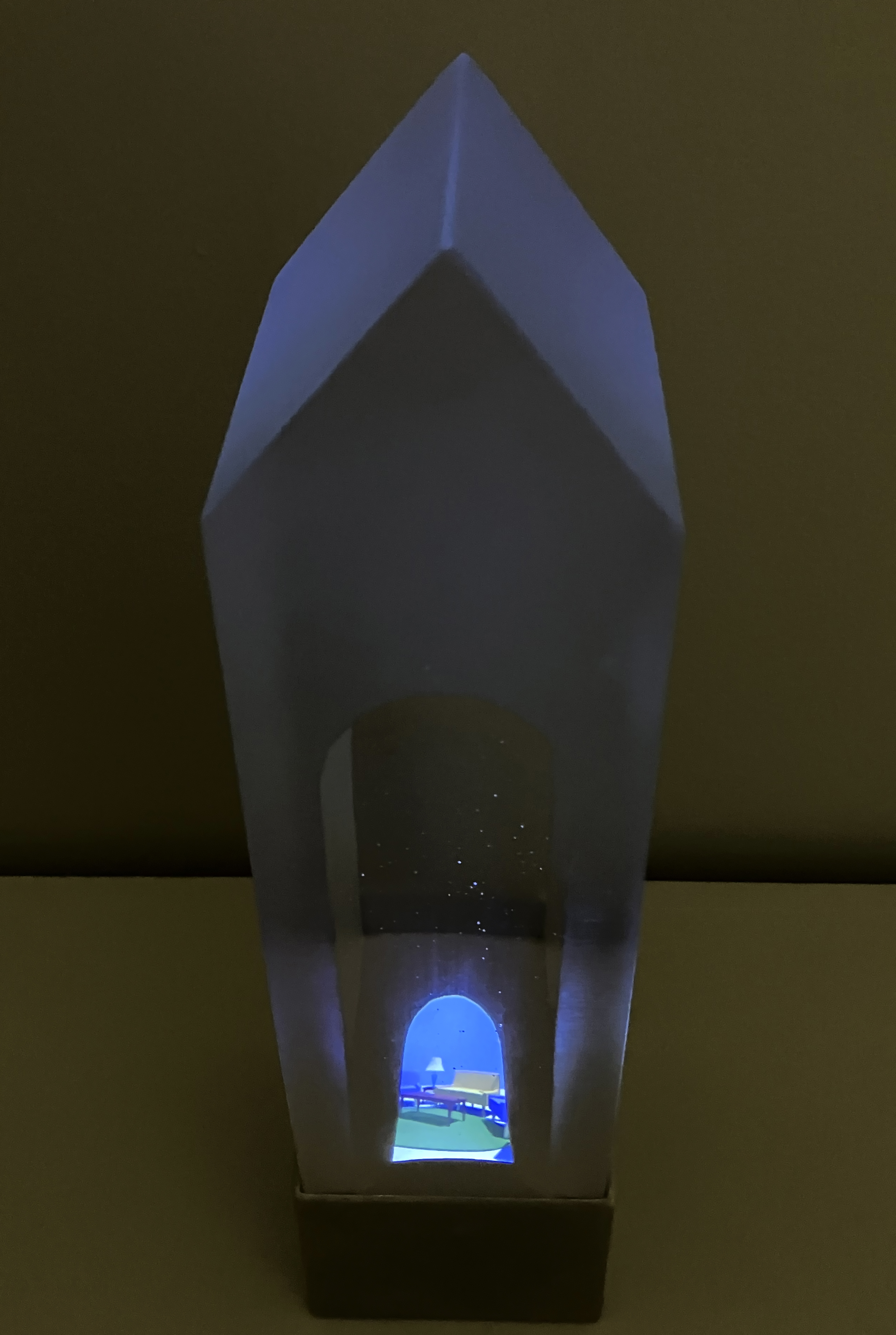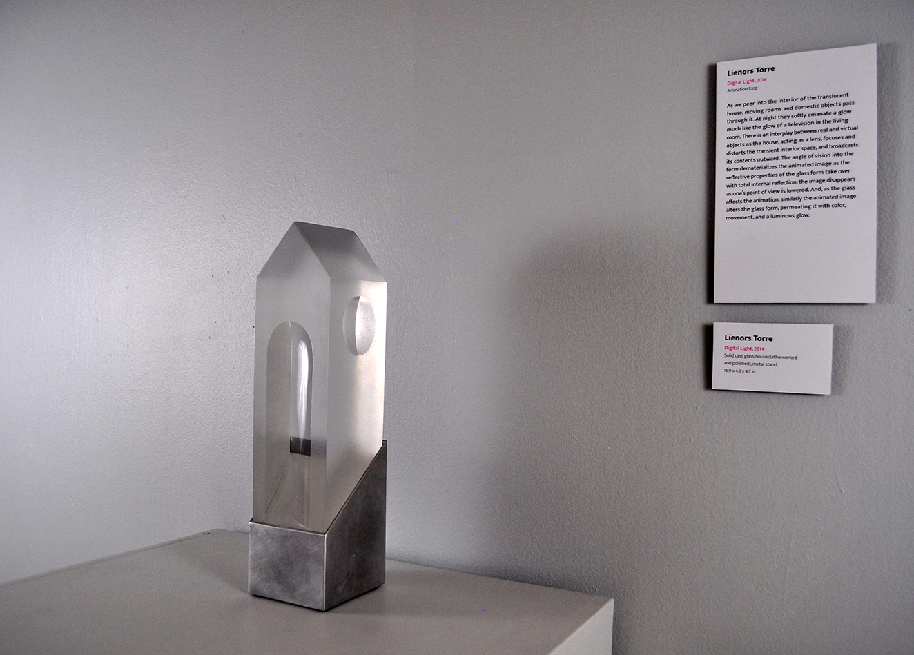 Digital Light (2014). As we peer into the interior of the translucent house, we witness moving rooms and domestic objects passing through. There is an interplay between real and virtual objects as the house, acting as a lens, focuses and distorts the transient interior space, broadcasting the contents outward. Our angle of vision through the glass transforms the animated image as the total internal reflective properties of the glass gain prominence; the image disappears as one’s point of view is lowered. Concurrently, the animated image alters the glass form, permeating it with color, movement, and a luminous glow.