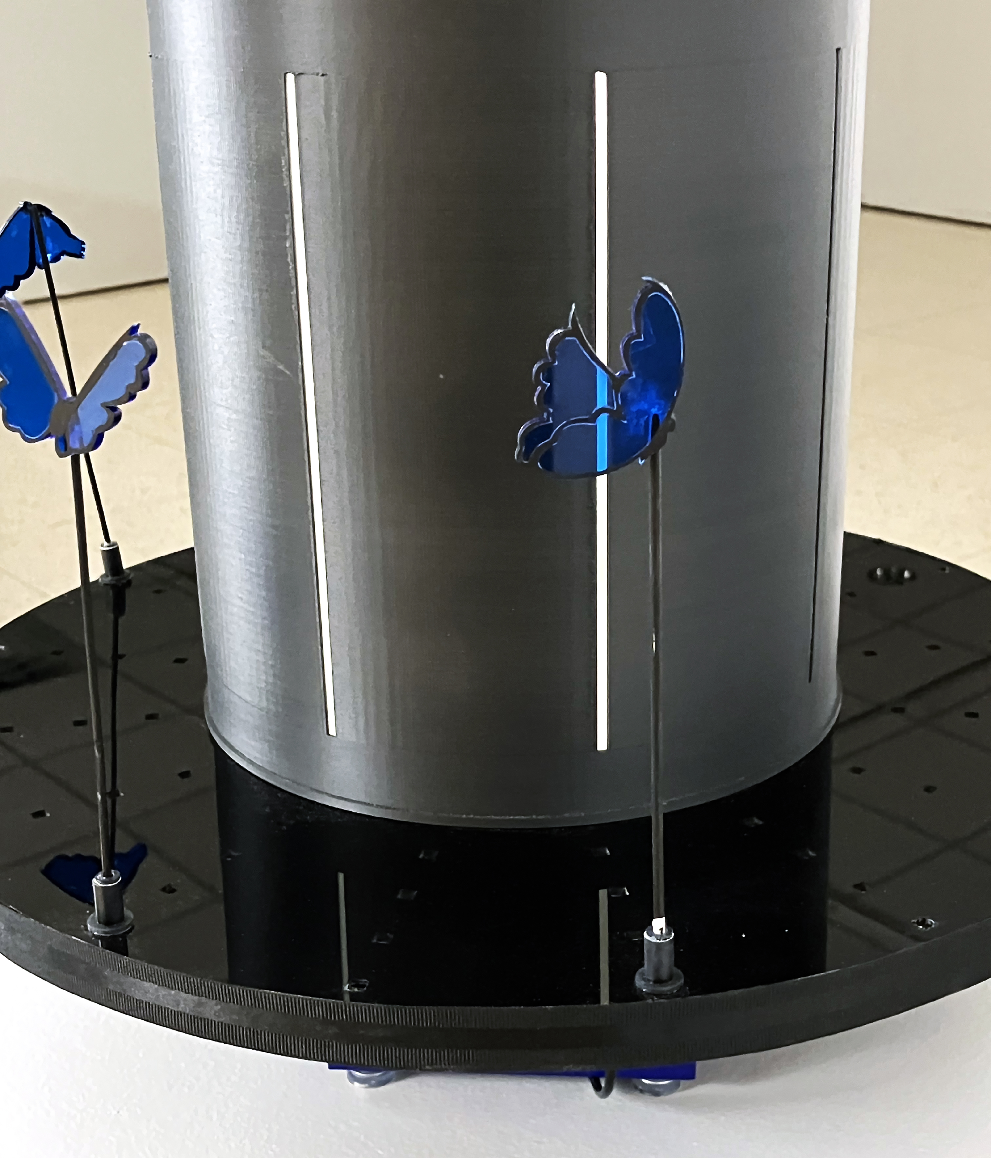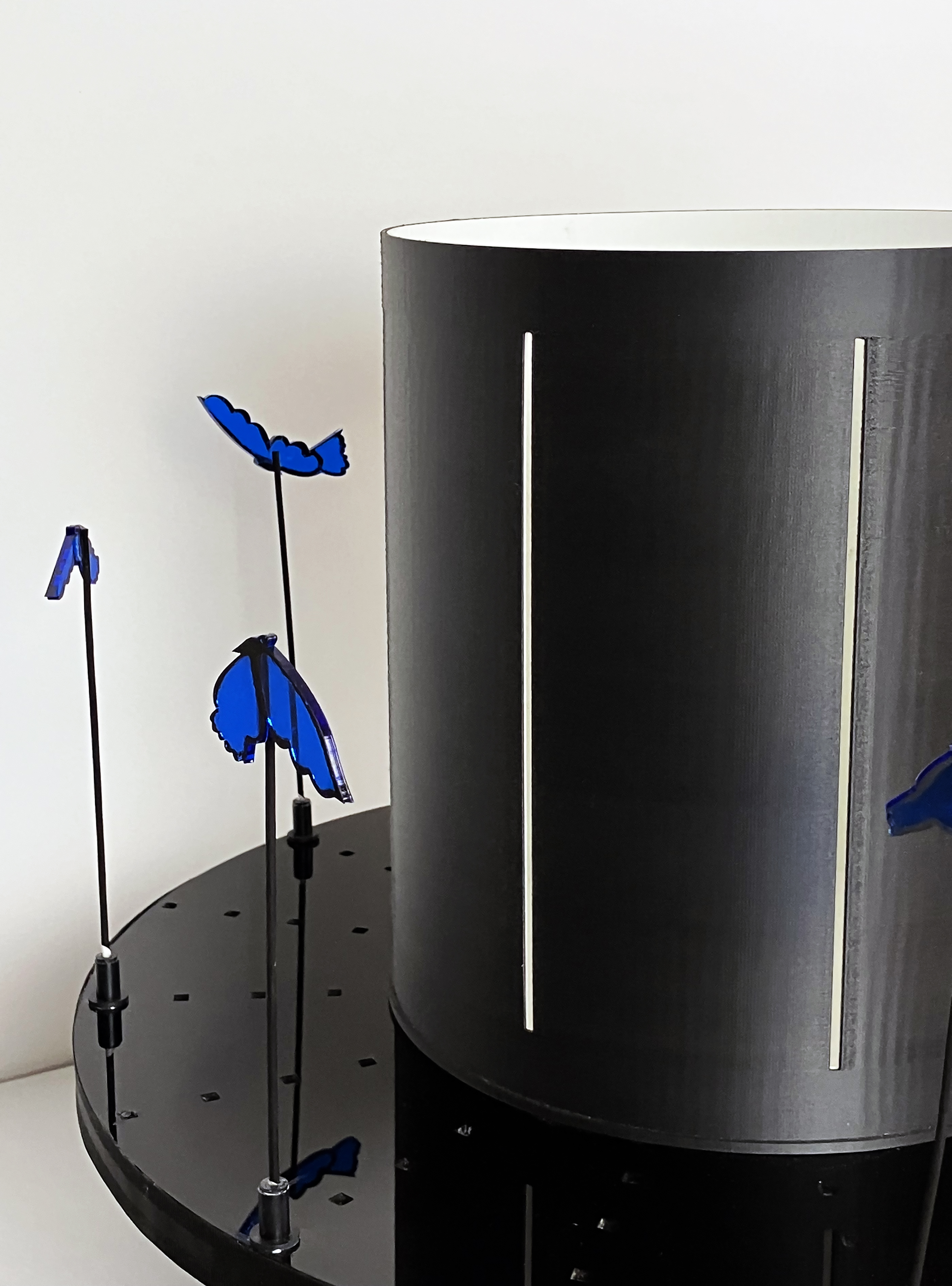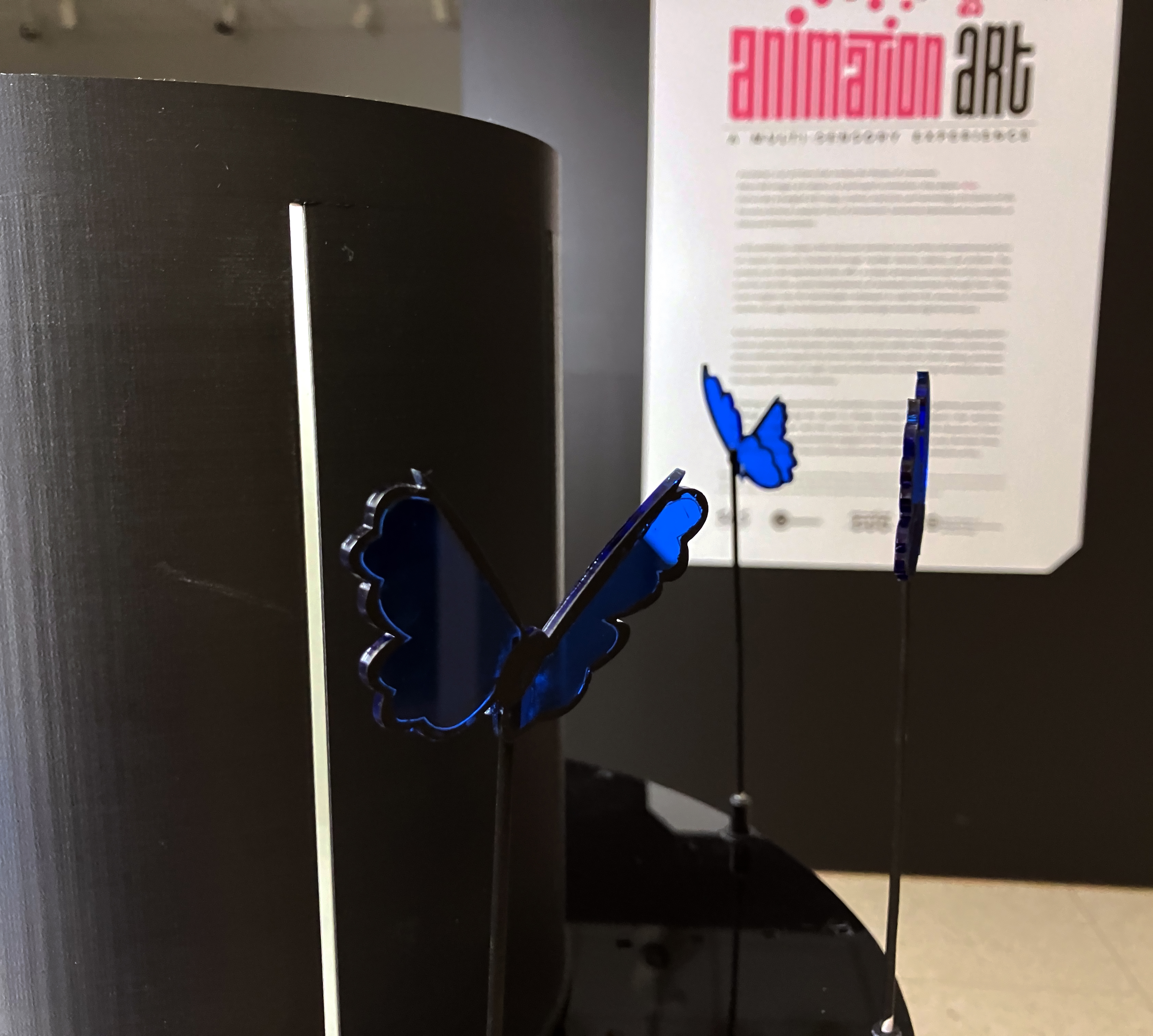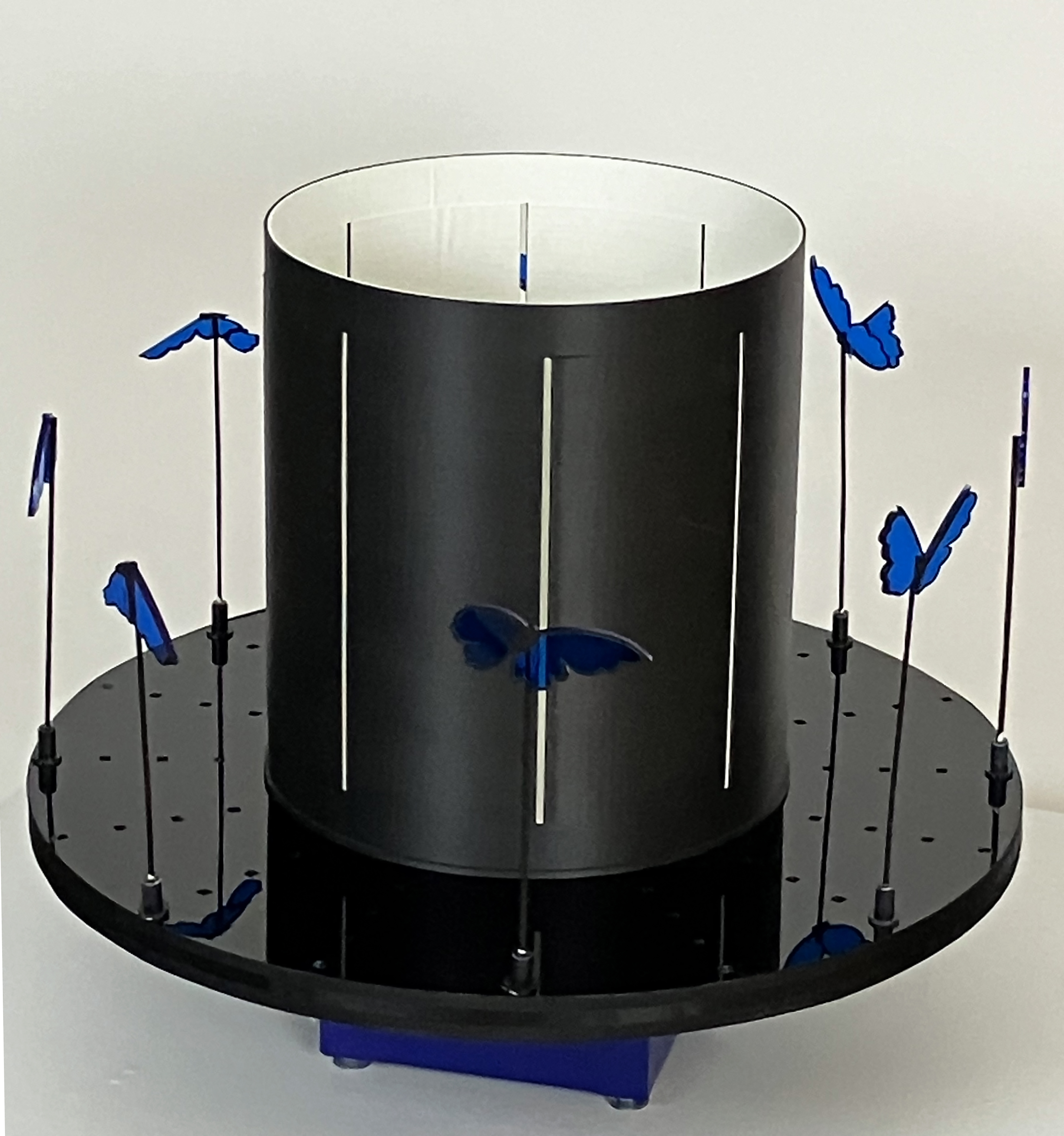 The material in my creative process refers to all the palpable physical objects, tools, and devices I use to create the animation. In the case of the Silhouette Zoetrope, in particular, the device's materiality creates an animated optical illusion. The fact that a multiplicity of sequential blue butterflies is perceived as one flying when the apparatus rotates establishes a haptic connection with the viewer. They become active agents in the perception and creation of animated motion. The illusion is not the same when recorded or filmed, and the fact that it invites people to experience it in person, without screens as intermediaries, adds a wondrous effect to it. The device's materiality connects the viewer and the animation more directly, making them the animator.