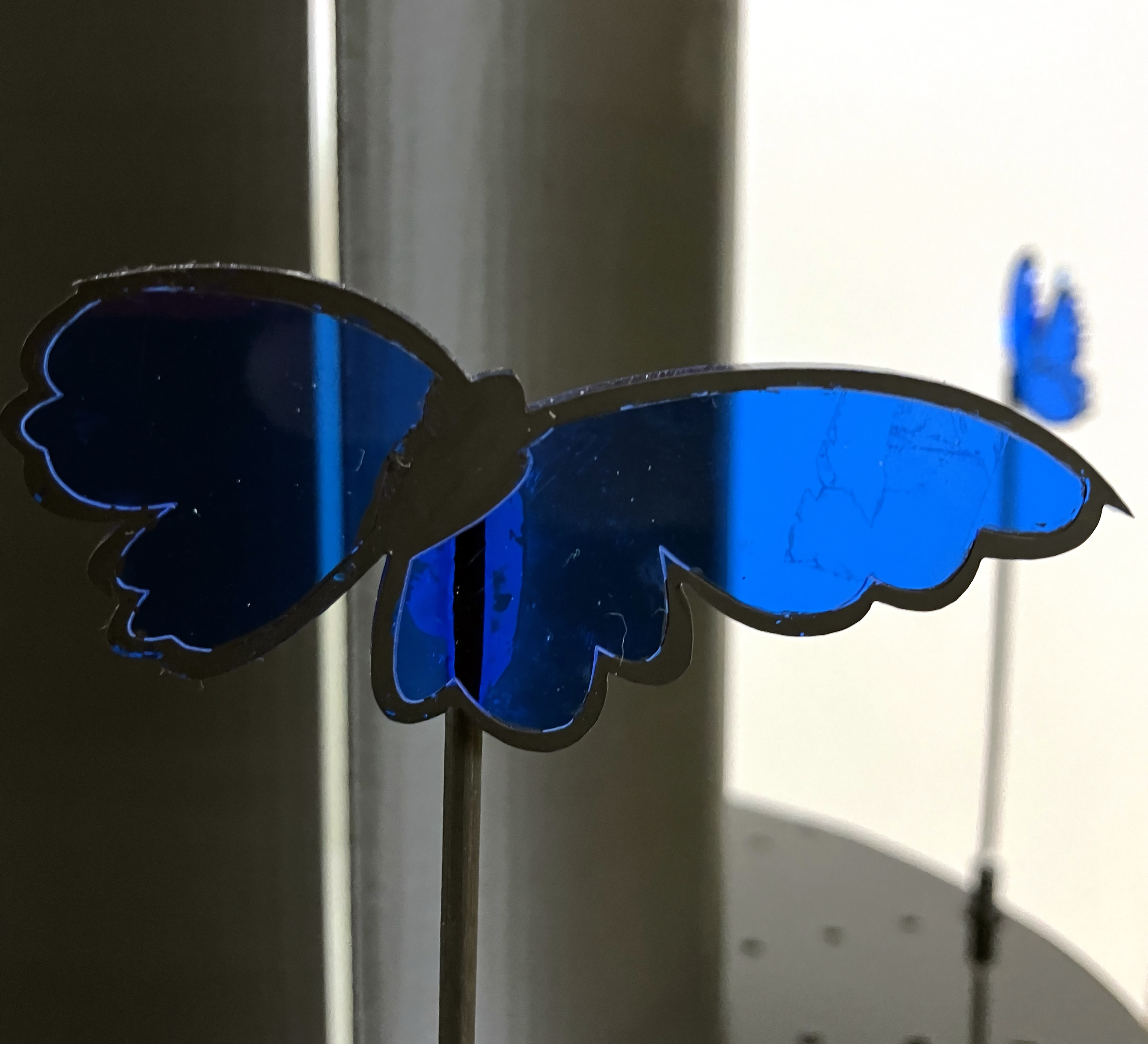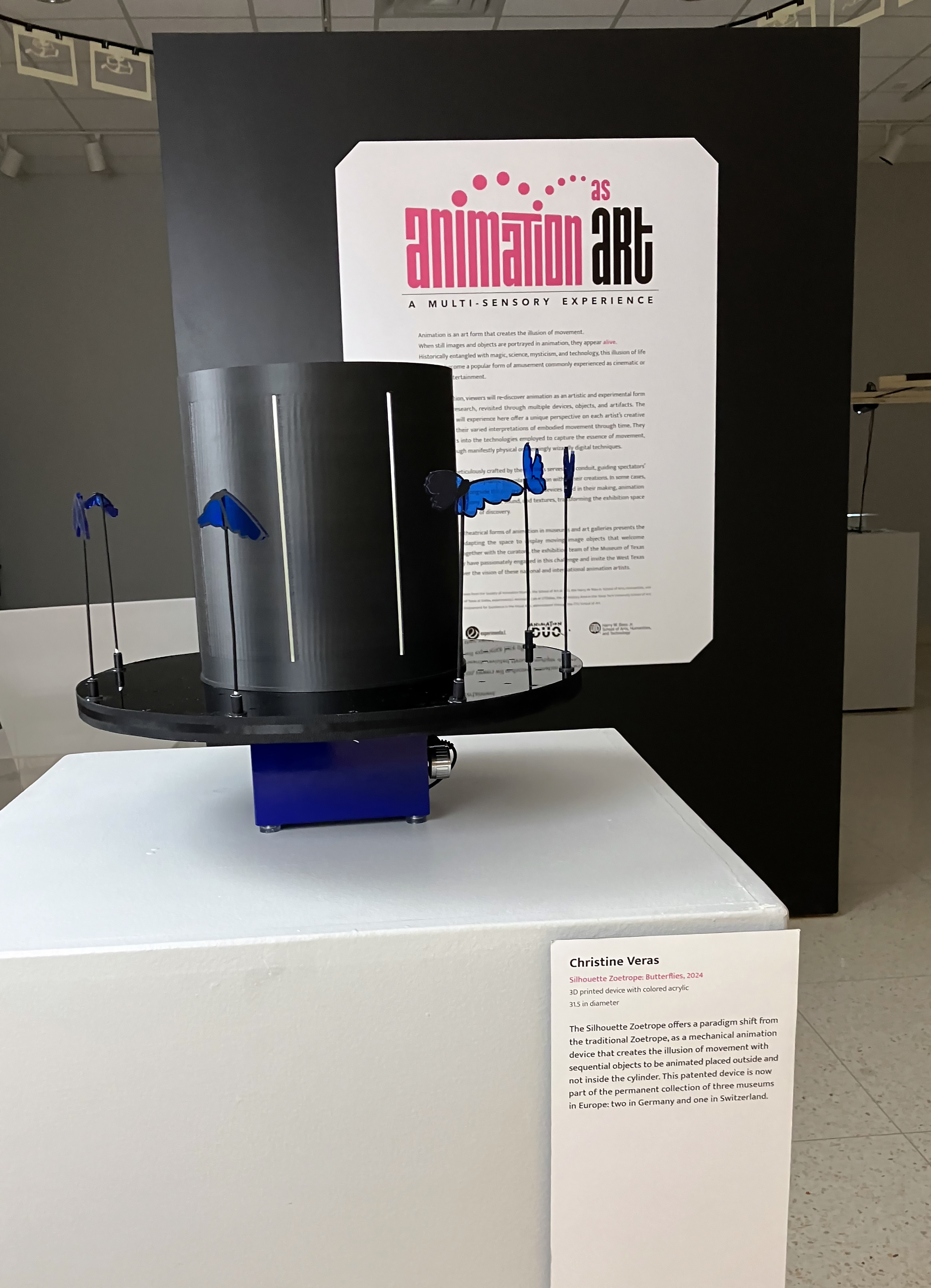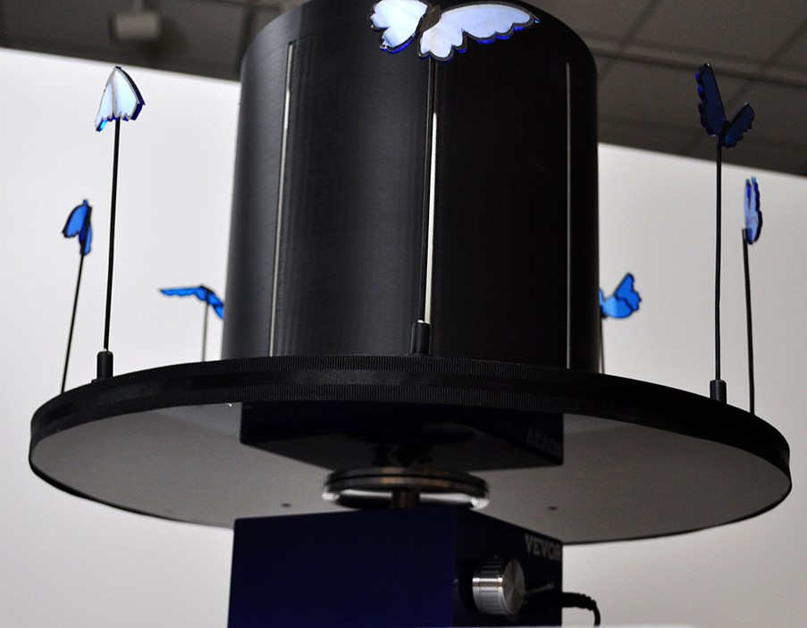 The material in my creative process refers to all the palpable physical objects, tools, and devices I use to create the animation. In the case of the Silhouette Zoetrope, in particular, the device's materiality creates an animated optical illusion. The fact that a multiplicity of sequential blue butterflies is perceived as one flying when the apparatus rotates establishes a haptic connection with the viewer. They become active agents in the perception and creation of animated motion. The illusion is not the same when recorded or filmed, and the fact that it invites people to experience it in person, without screens as intermediaries, adds a wondrous effect to it. The device's materiality connects the viewer and the animation more directly, making them the animator.