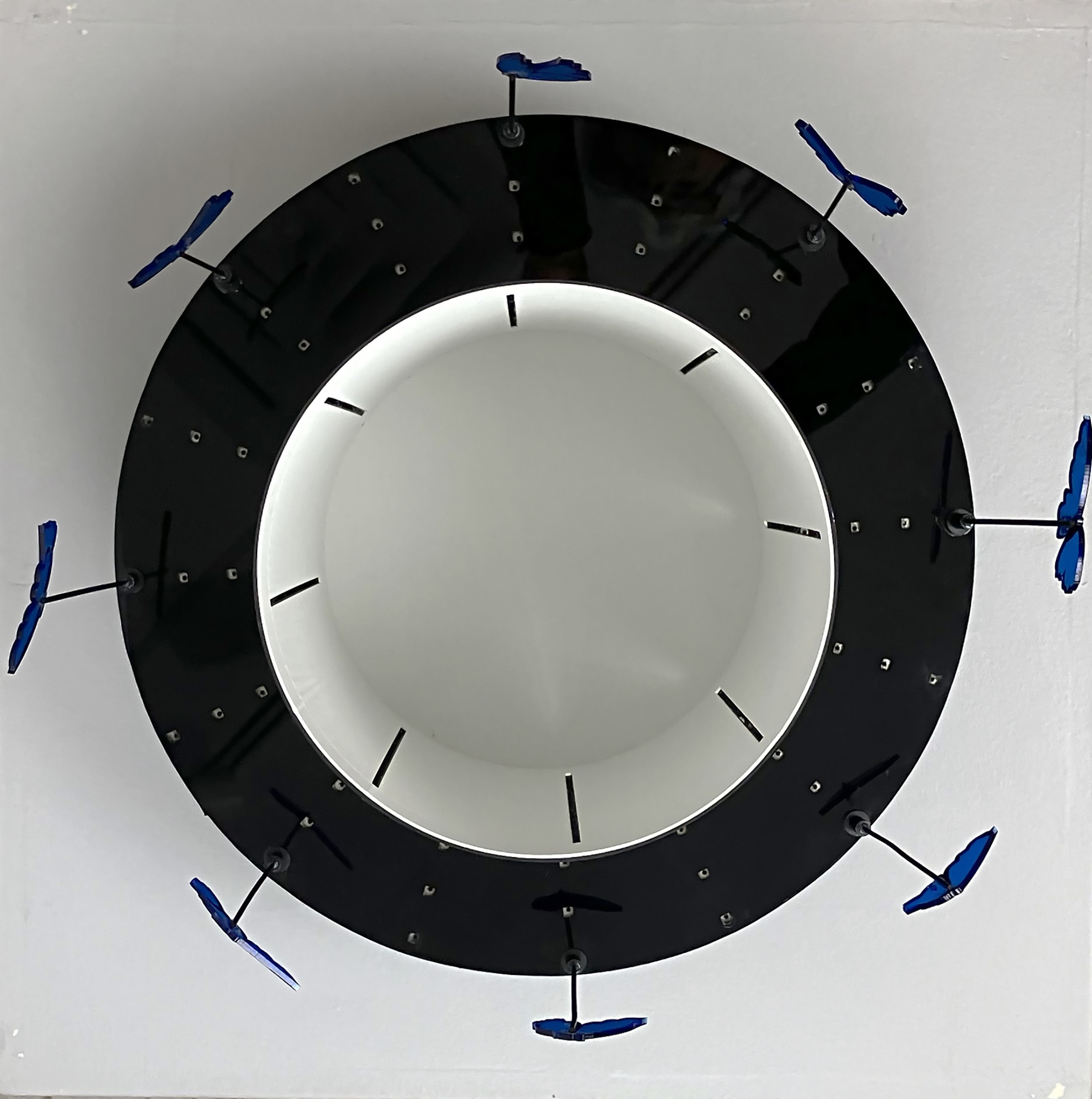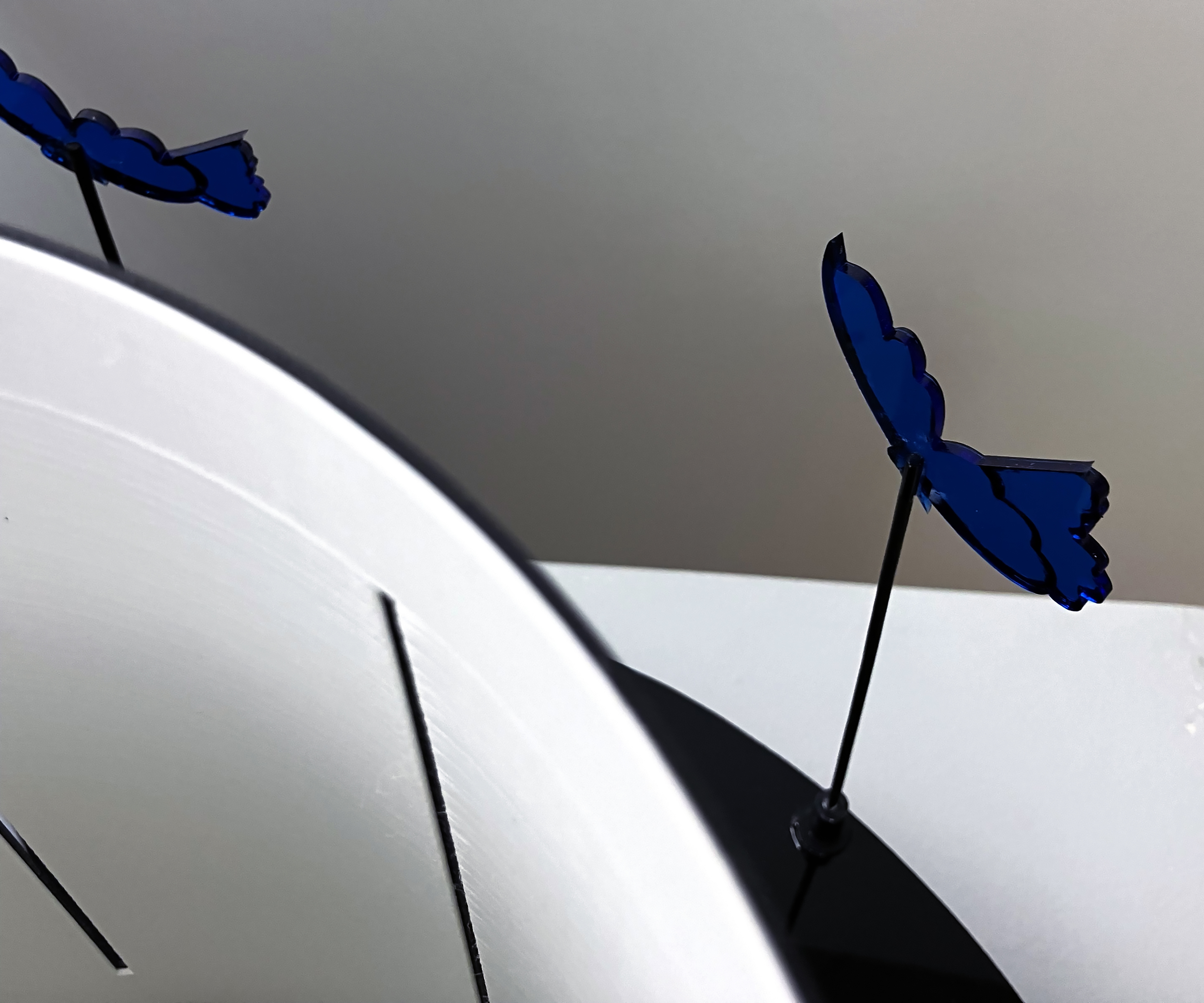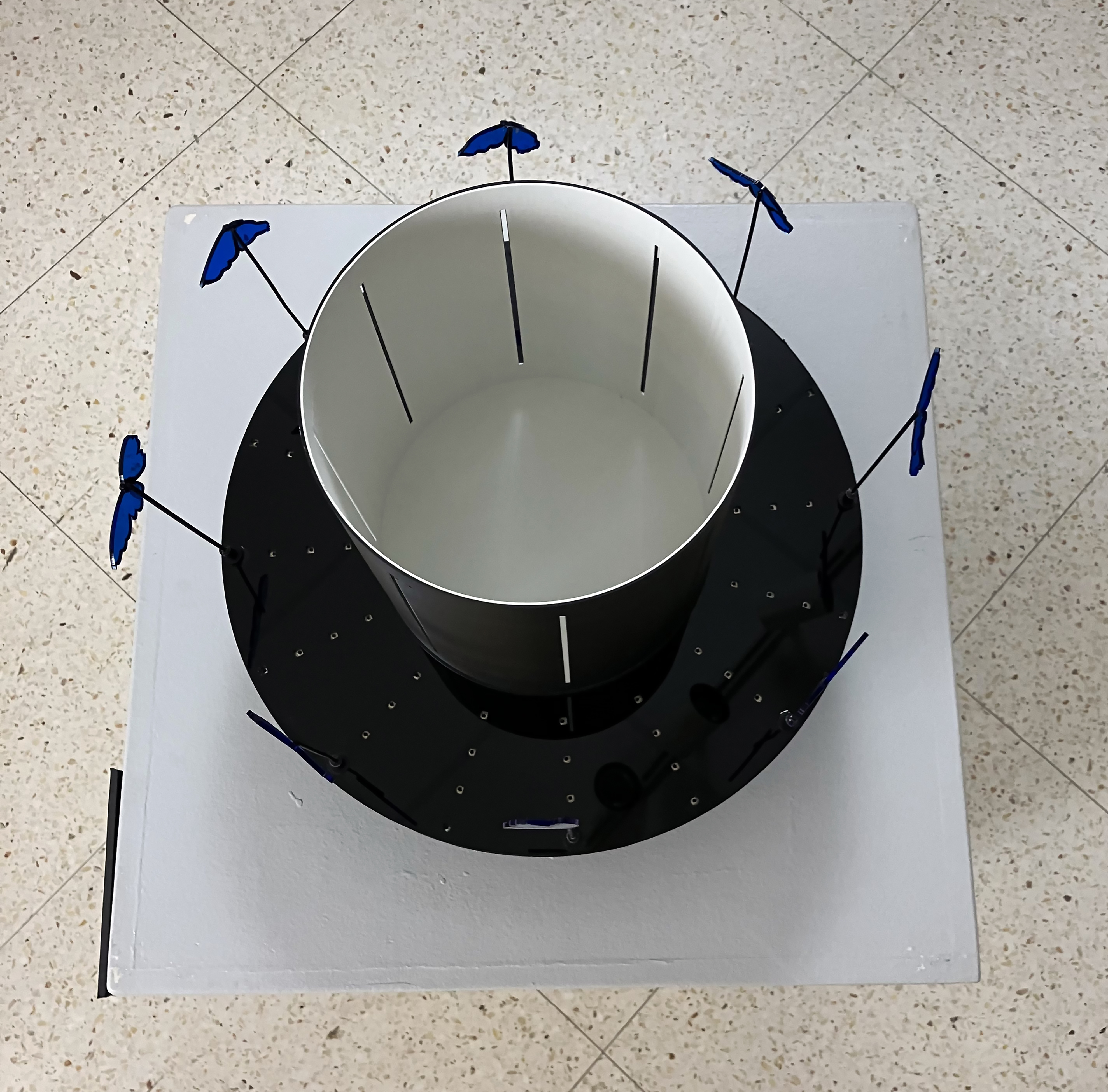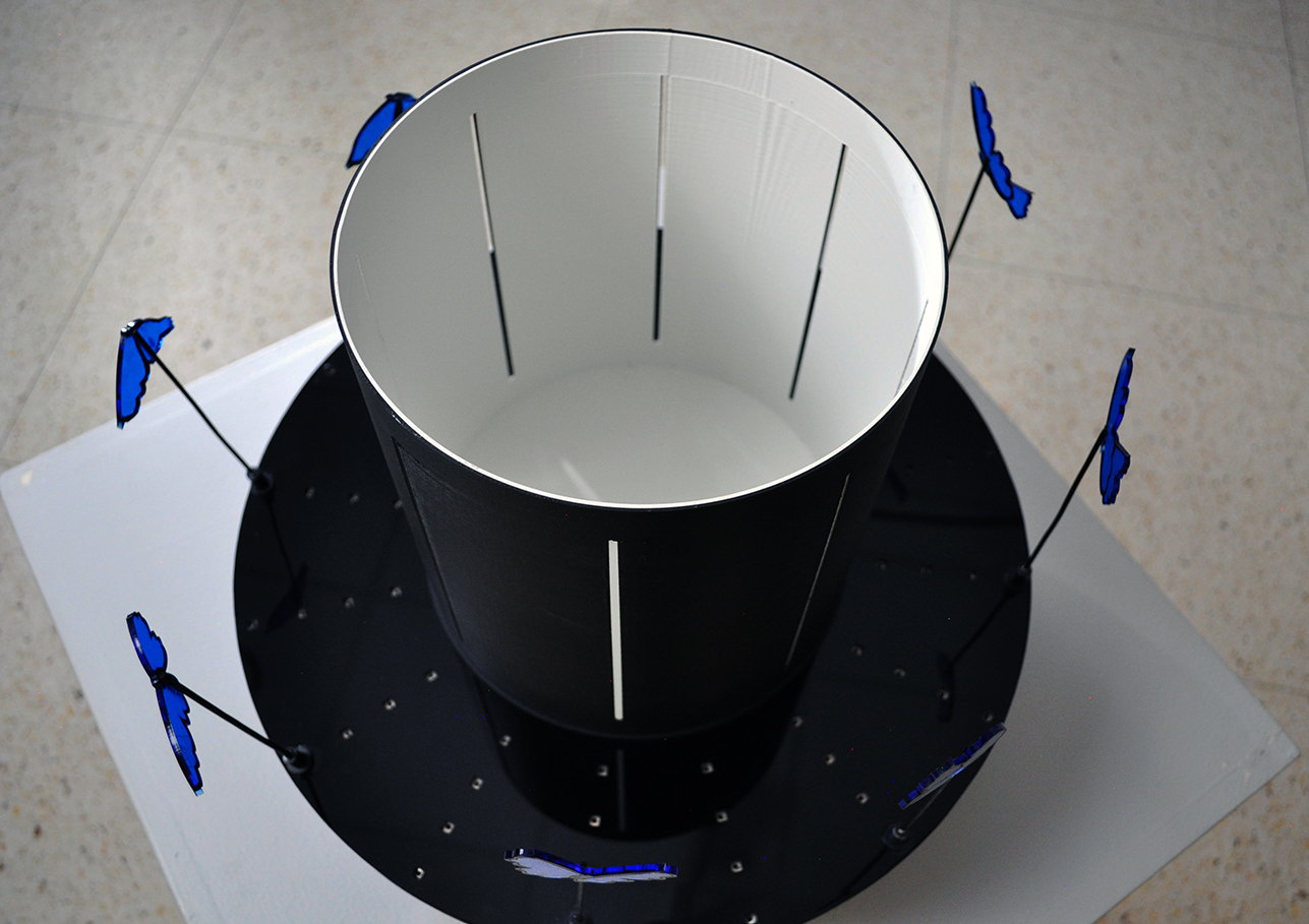 The material in my creative process refers to all the palpable physical objects, tools, and devices I use to create the animation. In the case of the Silhouette Zoetrope, in particular, the device's materiality creates an animated optical illusion. The fact that a multiplicity of sequential blue butterflies is perceived as one flying when the apparatus rotates establishes a haptic connection with the viewer. They become active agents in the perception and creation of animated motion. The illusion is not the same when recorded or filmed, and the fact that it invites people to experience it in person, without screens as intermediaries, adds a wondrous effect to it. The device's materiality connects the viewer and the animation more directly, making them the animator.