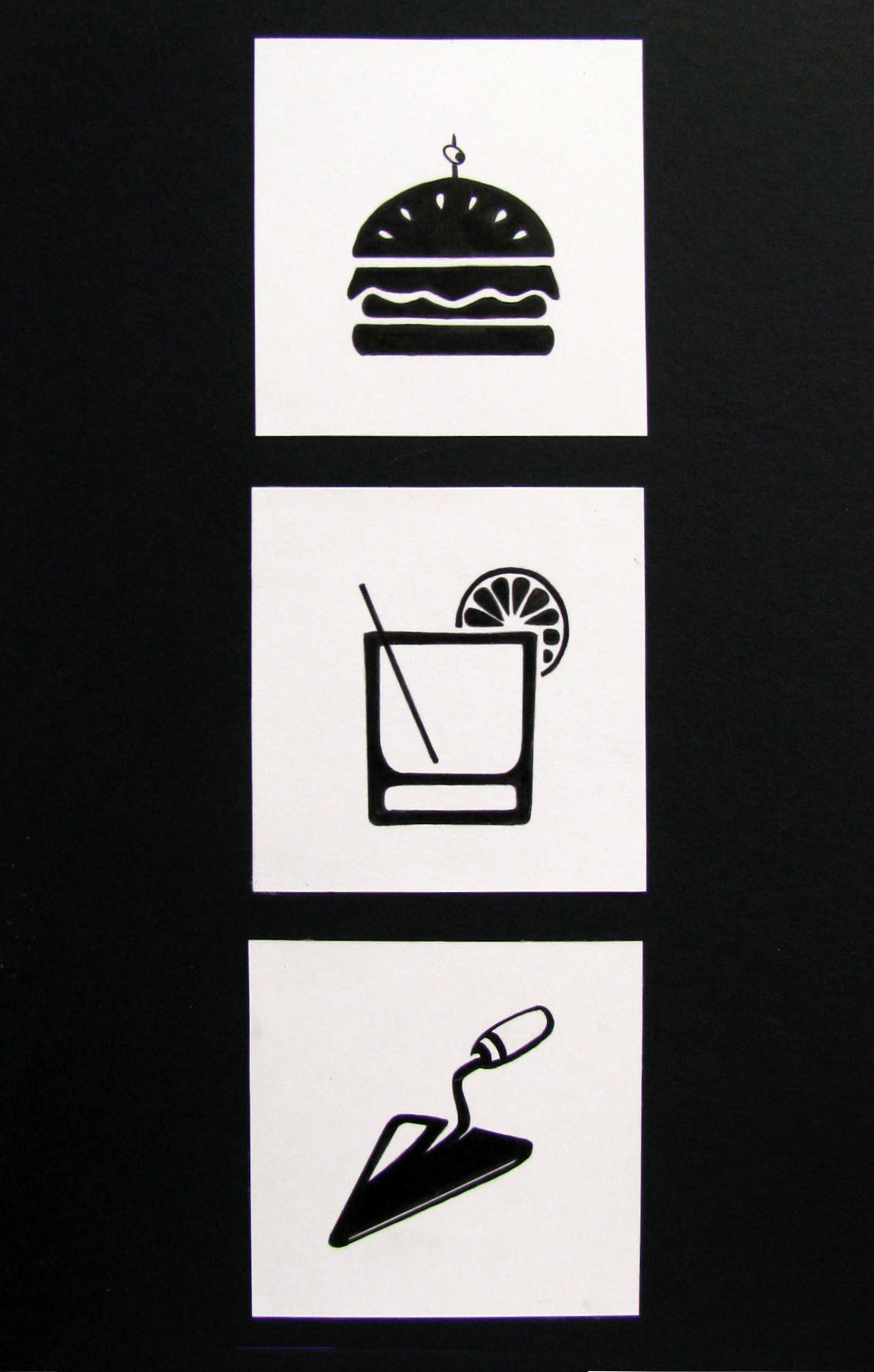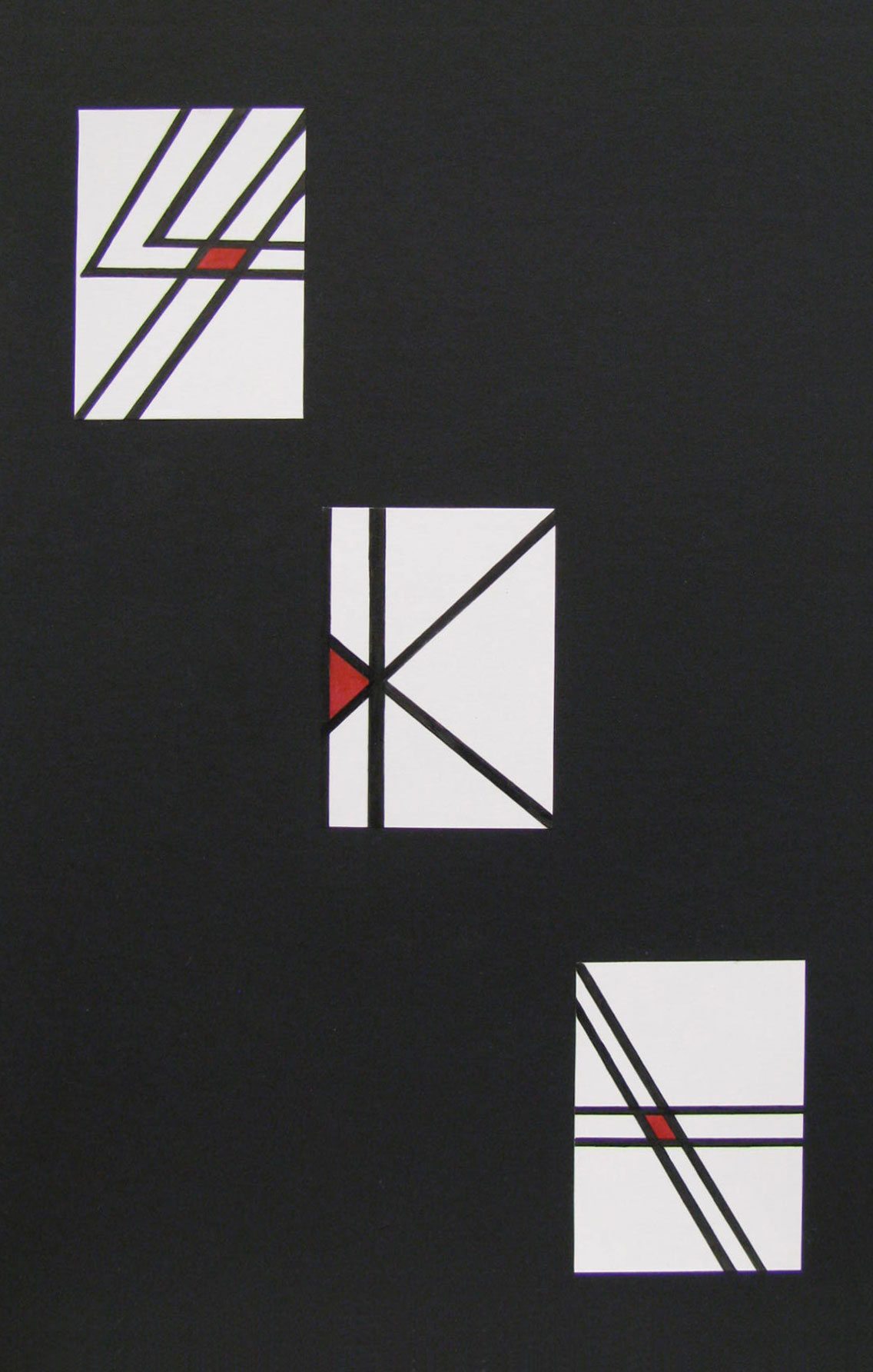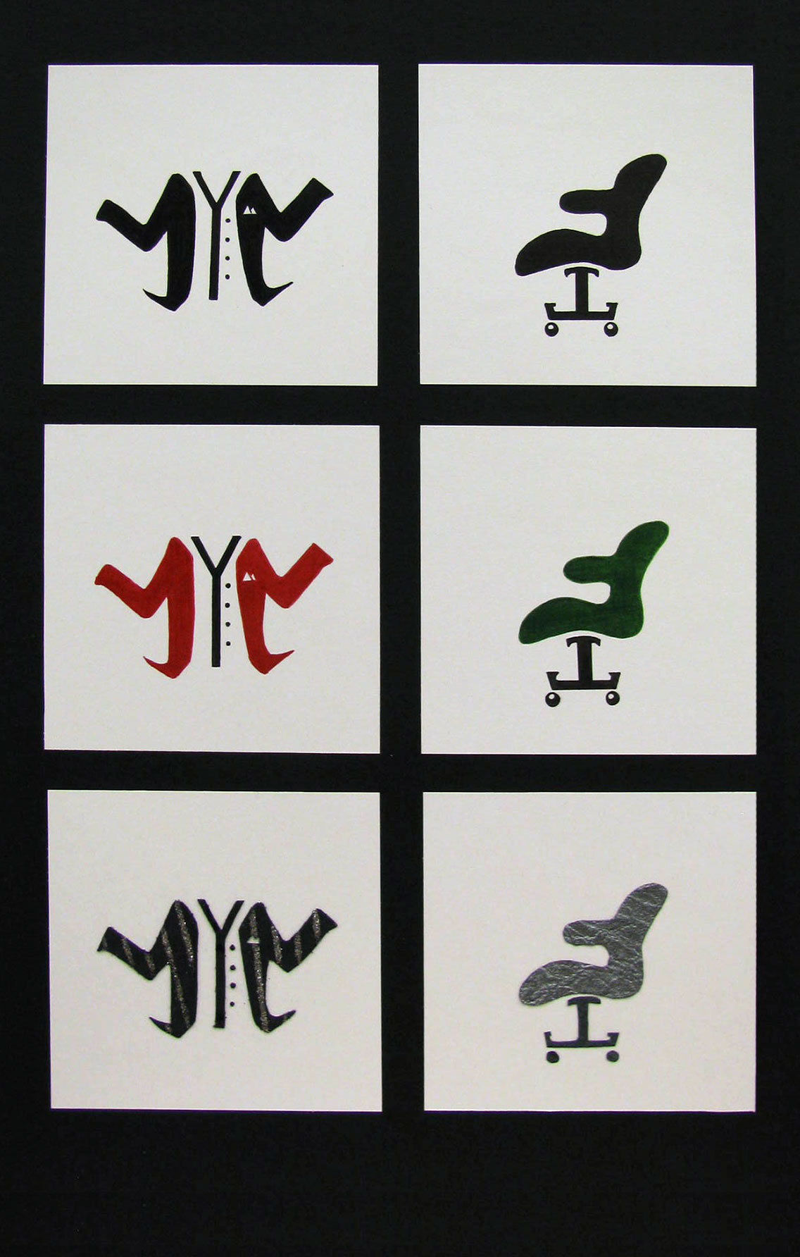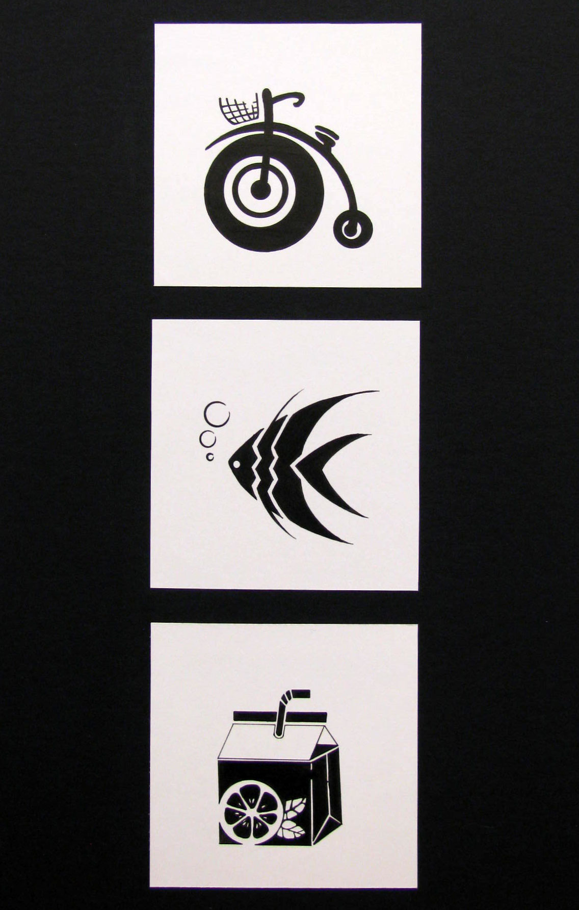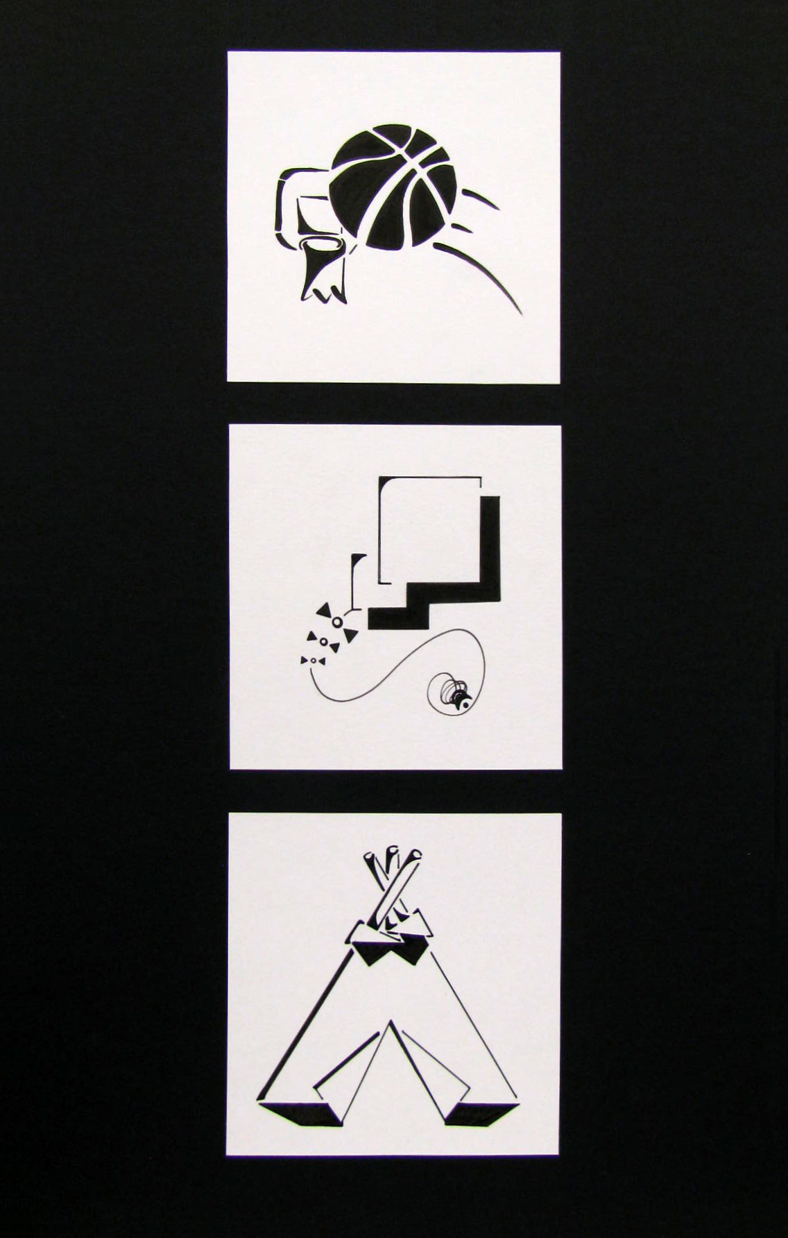 The goal of this exercise is to train students to work abstractly and how to use to their advantage negative and positive space, line consistency, and composition arrangement. Students create three sets of symbols based on the basic geometric shapes: circle, square, and triangle. Through critiques and analysis, students choose one from each set and reproduce it with black marker on a 4x4 white cardboard.