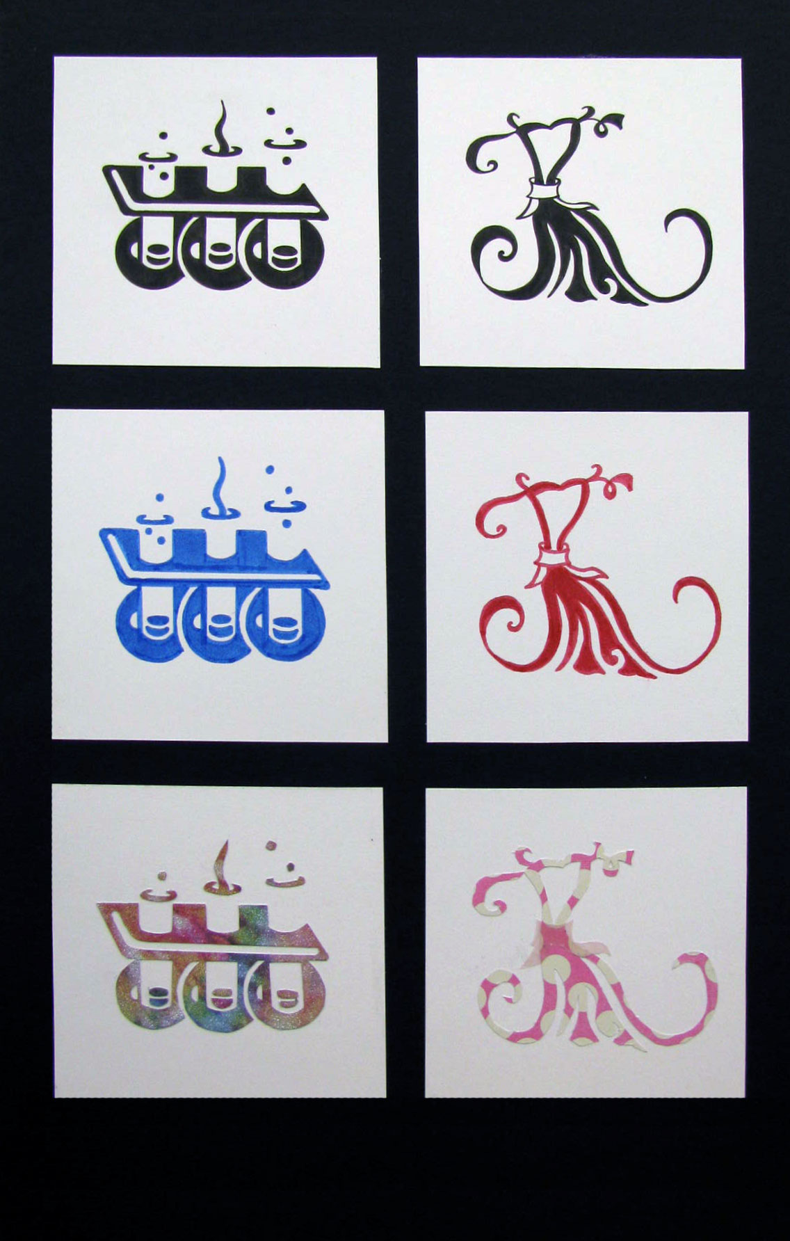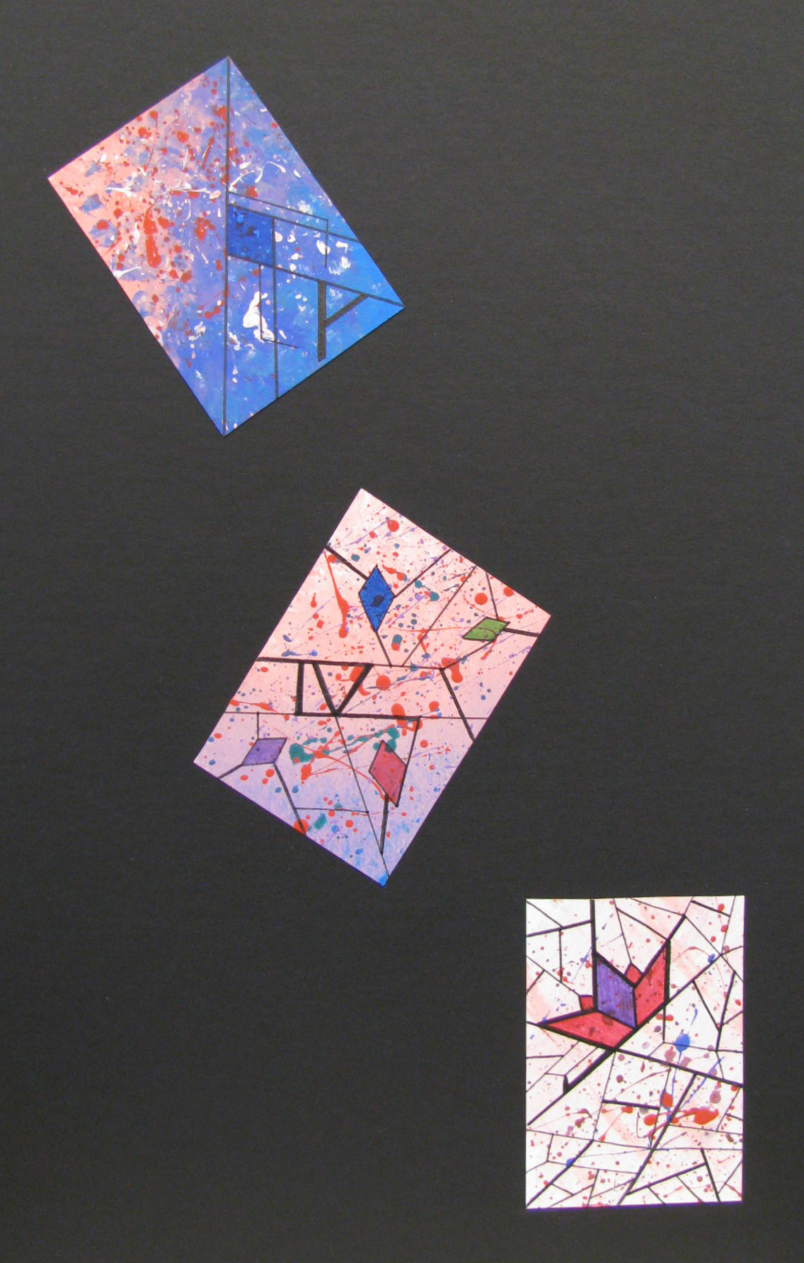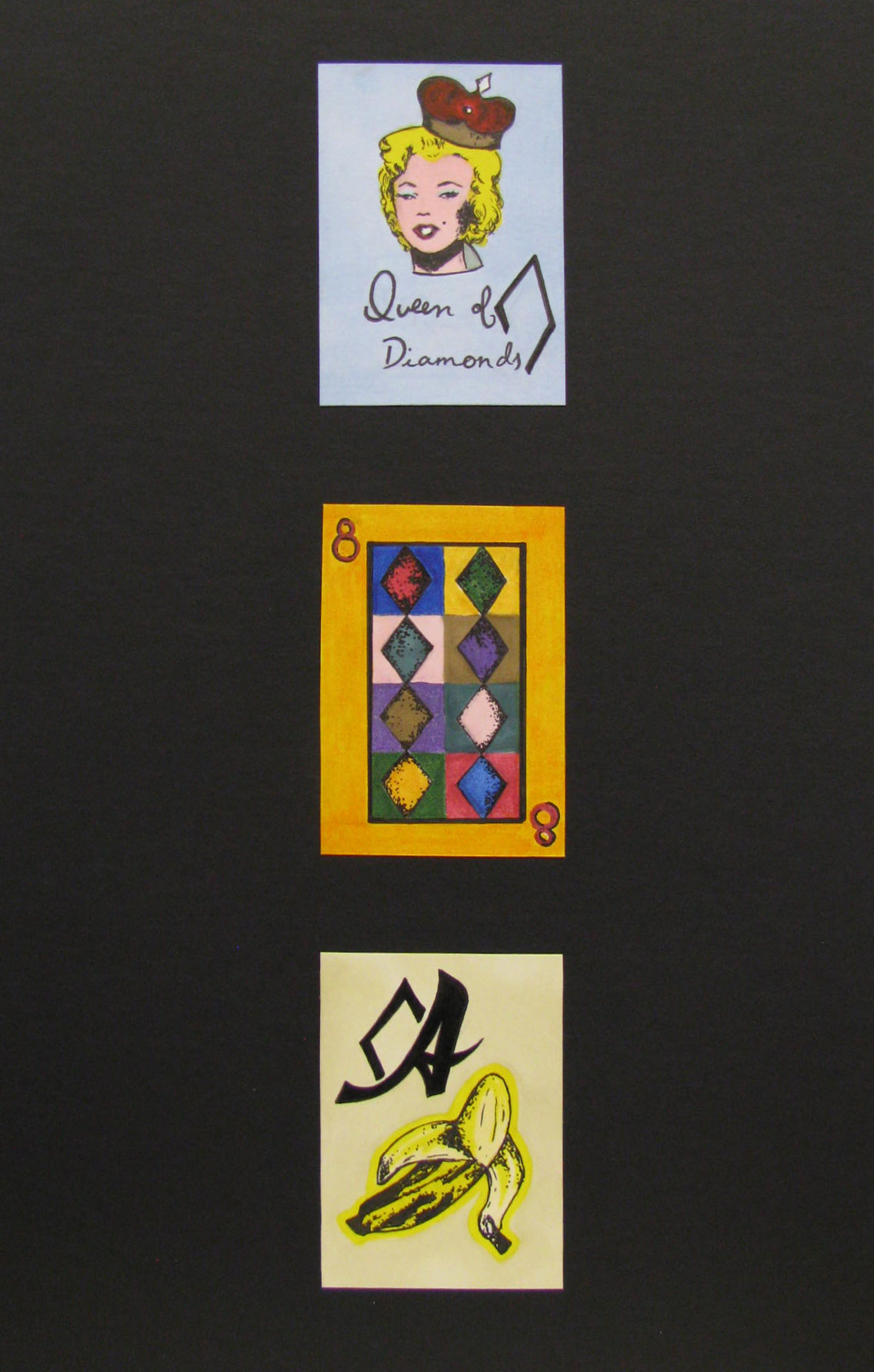 This is the last assignments in the class, once the students have more control over the media required for the class. The students are given randomly an art movement and do extensive resear on it or an artist associated to the movement; they are also given a card suit, and the value of three cards (a face card, a number, and the ace). The goal is to design three cards based on the art movement and arrange them on the mounting board as they see fit.